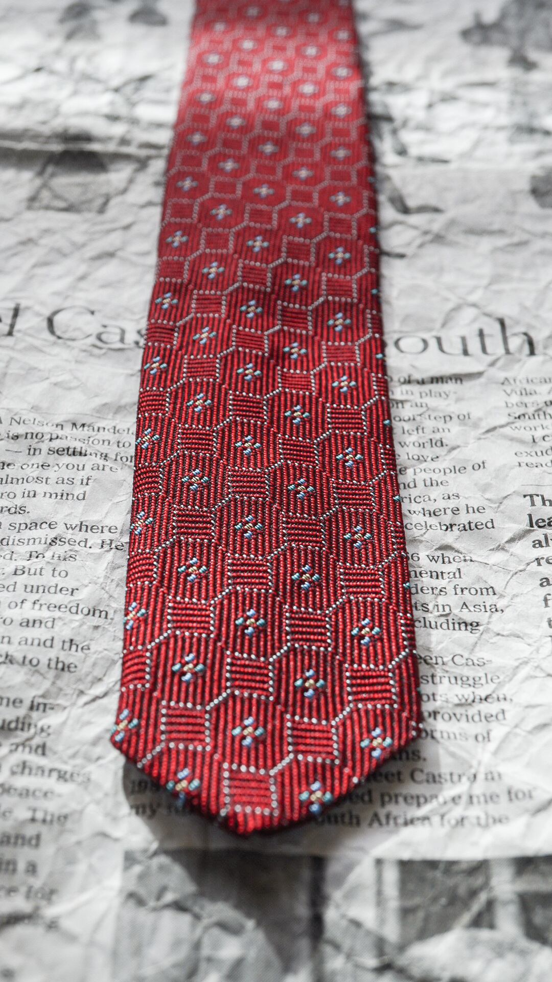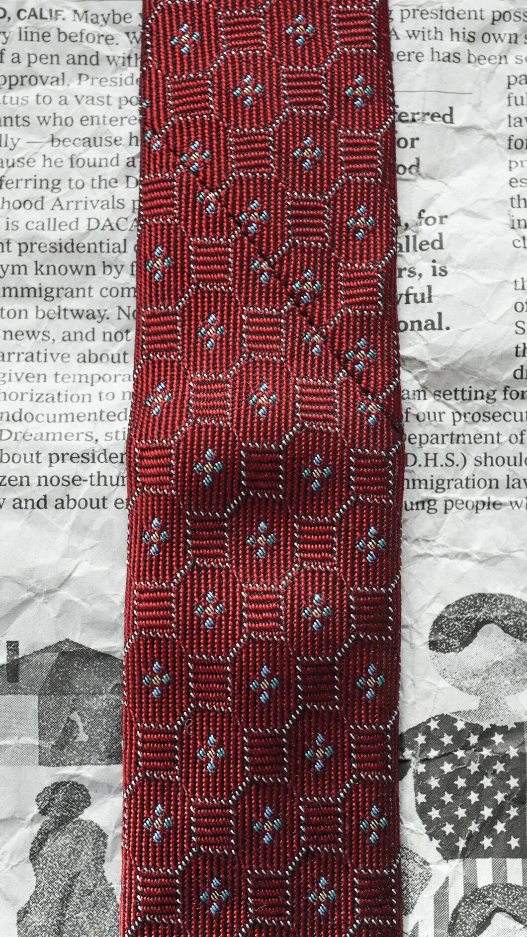 シルク100%の光沢がある生地で作られた小紋柄のネクタイで、ベースカラーはバーガンディになります。