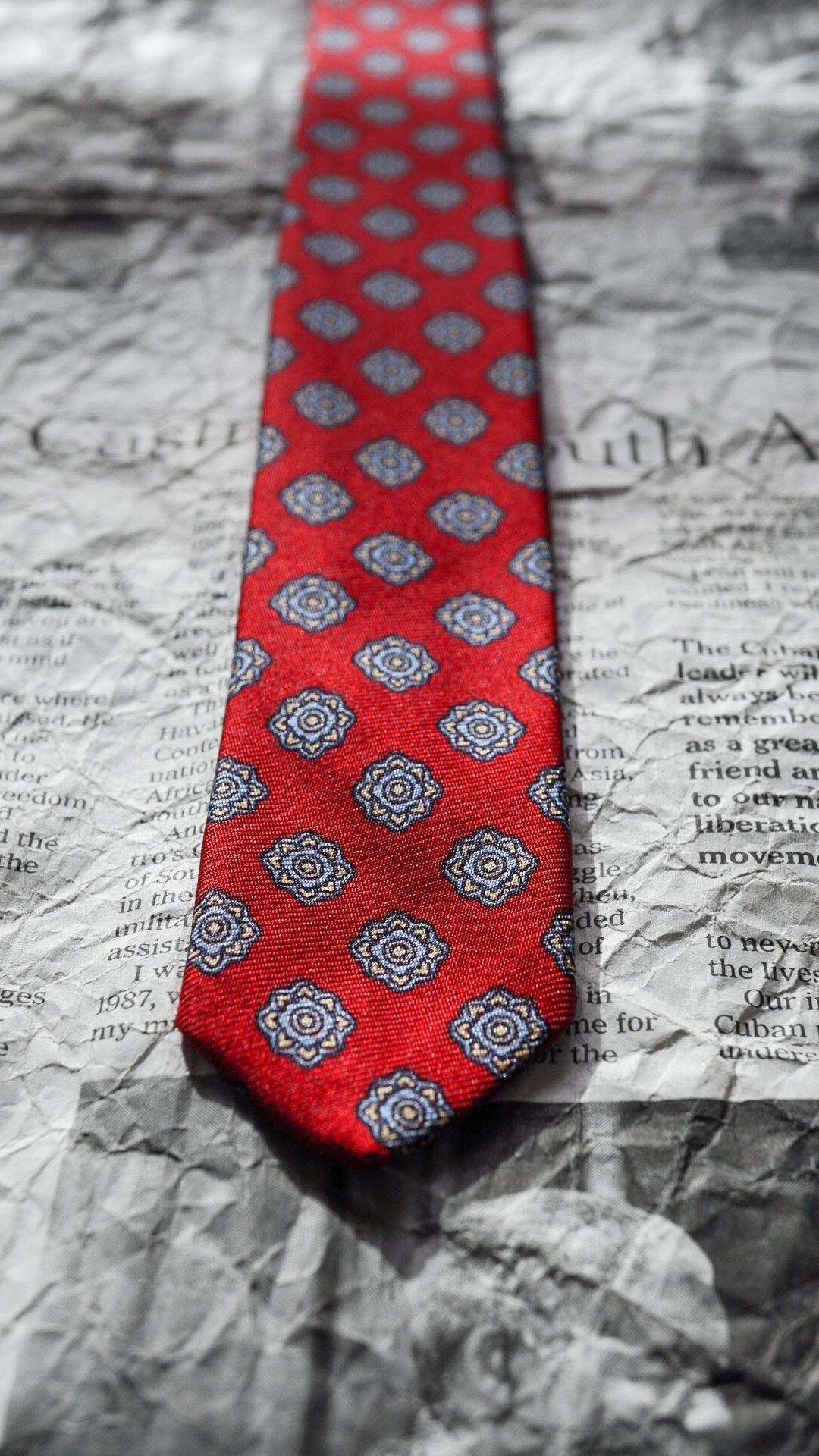 シルク100%の光沢がある生地で作られた小紋柄のネクタイで、ベースカラーはレッドになります。