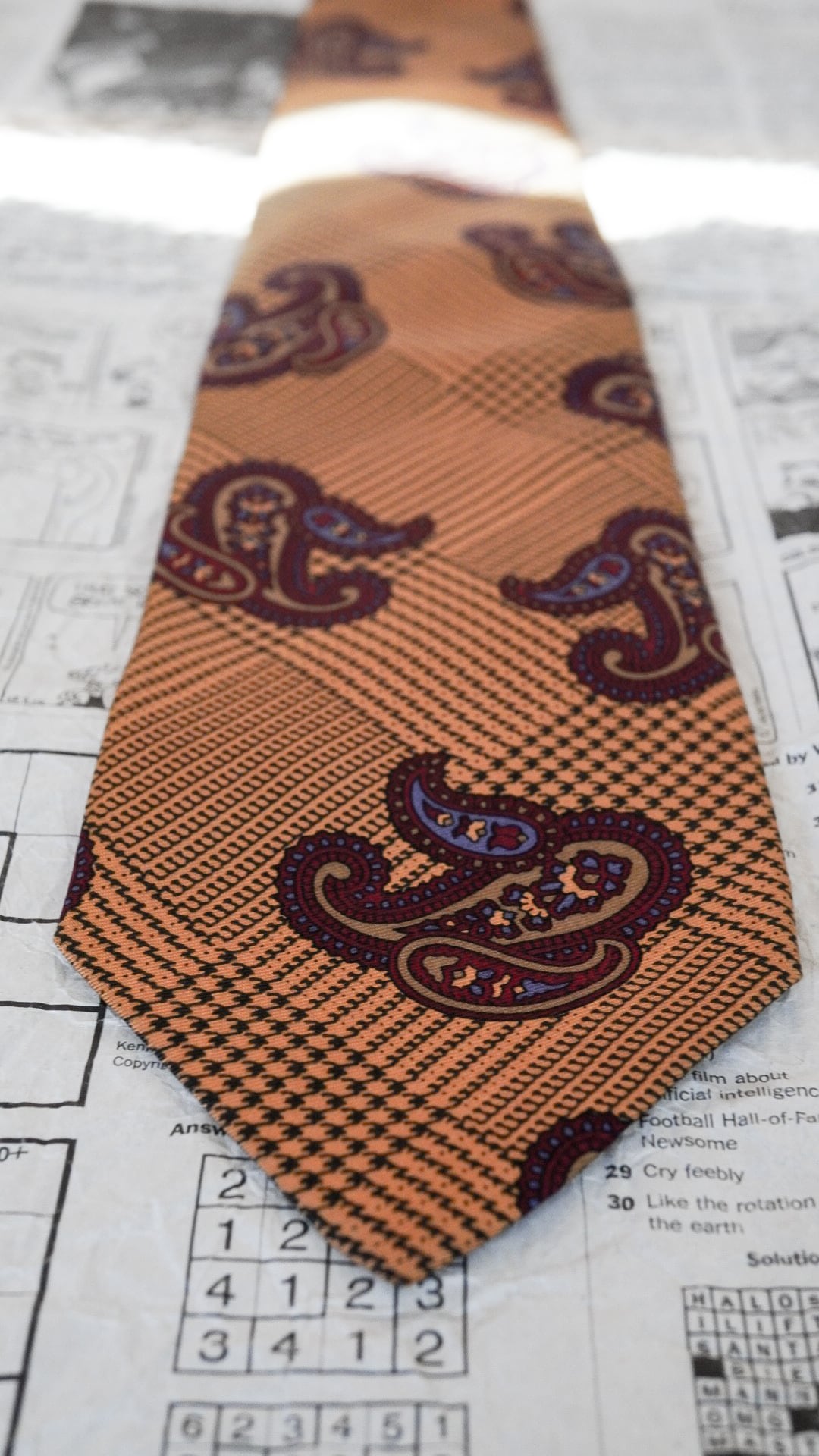 シルク100%の光沢がある生地で作られたペイズリー柄のネクタイで、ベースカラーはオーカー(黄土色)になります。