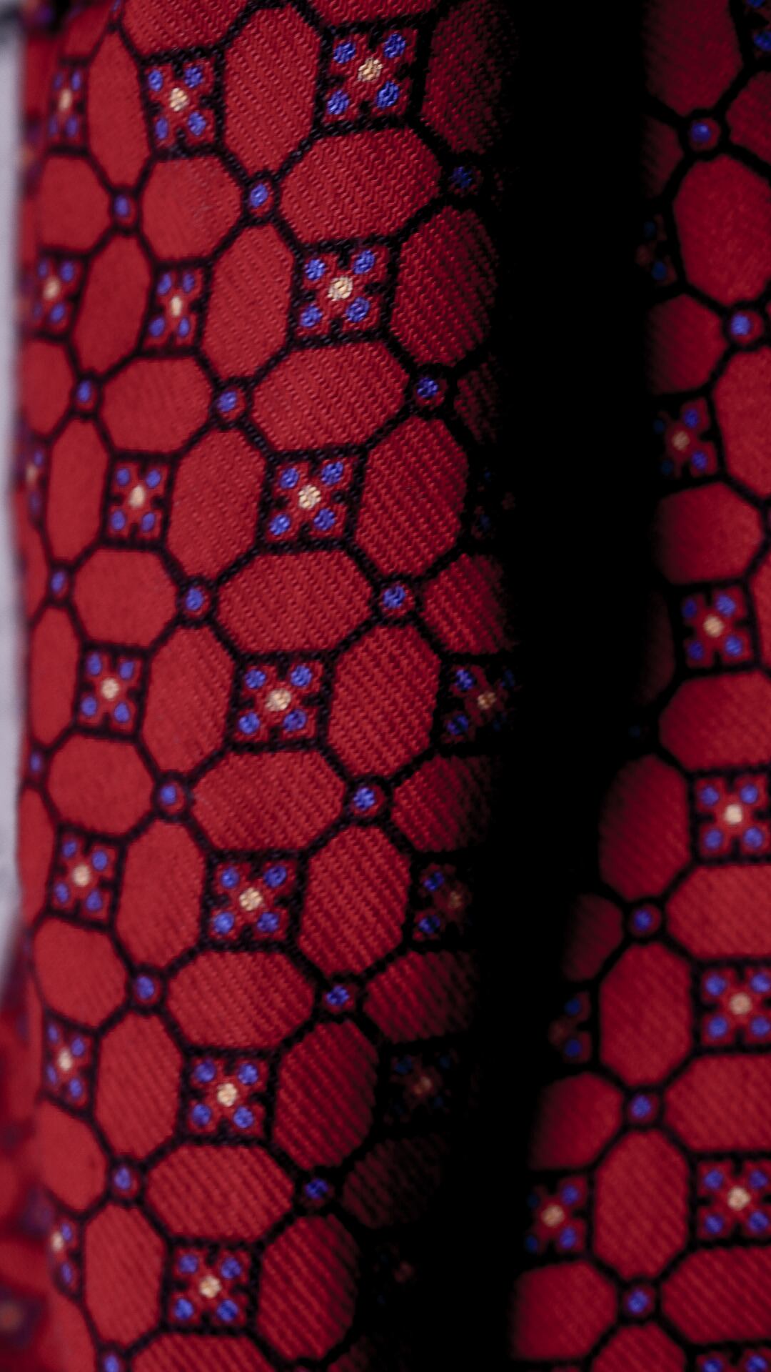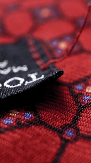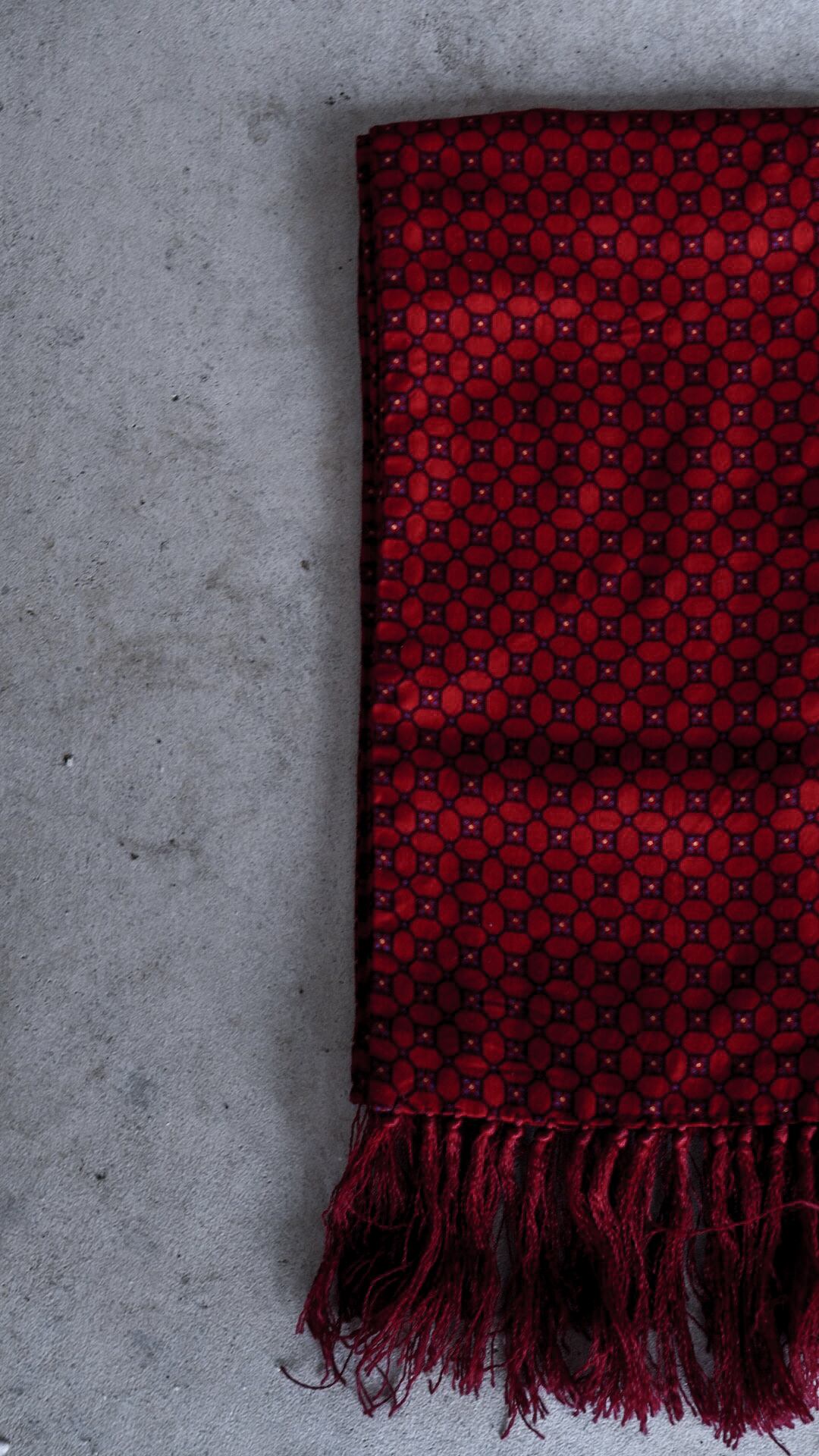 レーヨン生地で作られた小紋柄のスカーフで、ベースカラーはバーガンディになります。