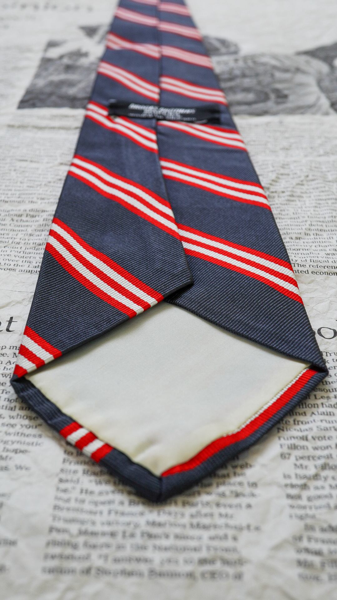 シルク100%の光沢がある生地で作られた定番のレジメンタルストライプ柄のネクタイで、カラーはグレー×レッド×ホワイトの配色になります。