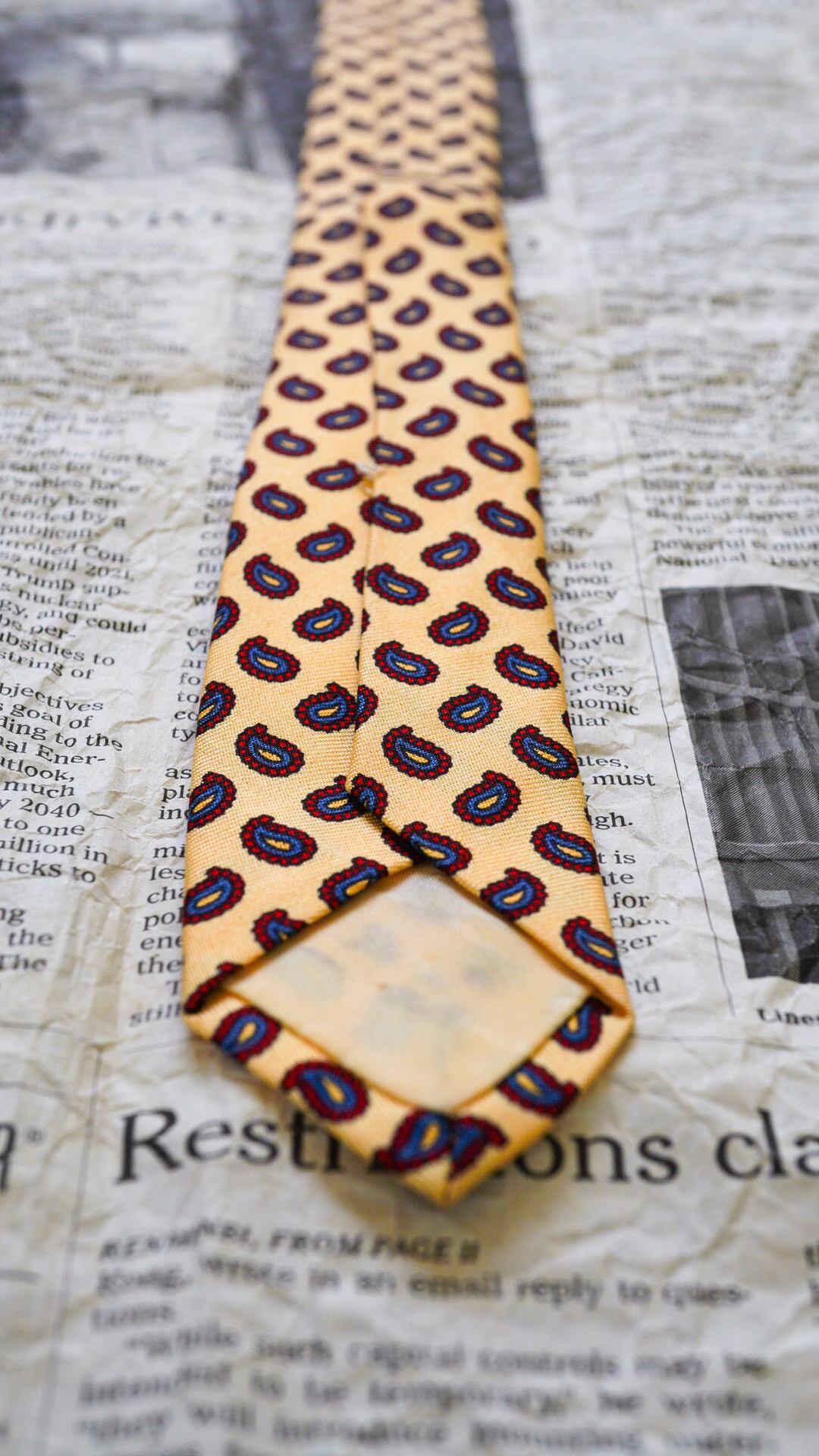 シルク100%の光沢がある生地で作られたペイズリー柄のネクタイで、ベースカラーはイエローになります。
