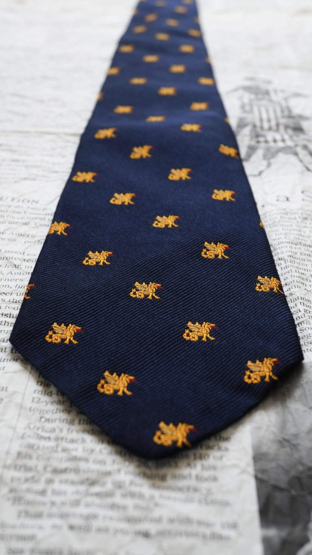 シルク混(シルク65%、ポリエステル35%)の光沢がある生地で作られたドラゴン柄のネクタイで、ベースカラーはネイビーになります。