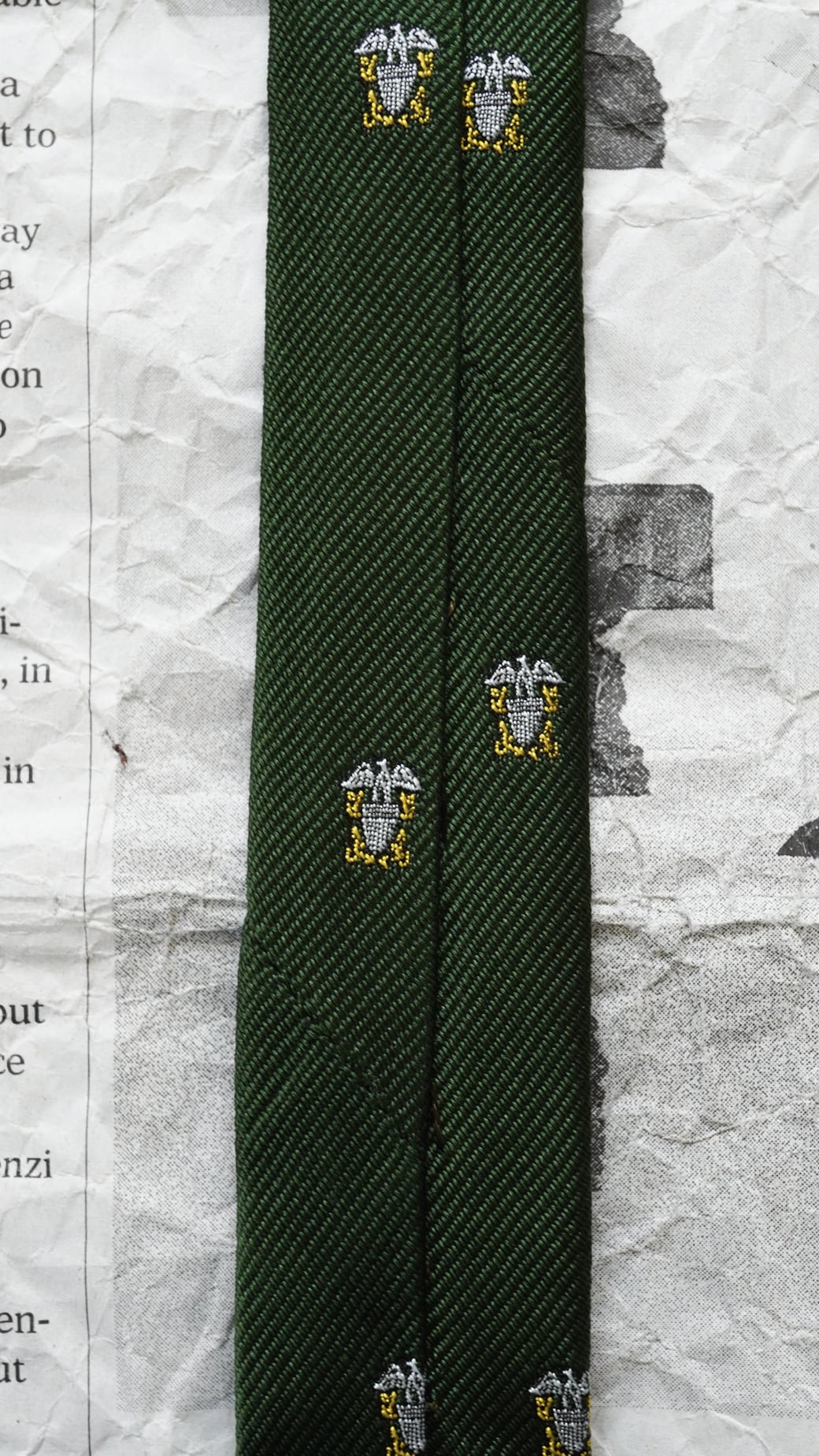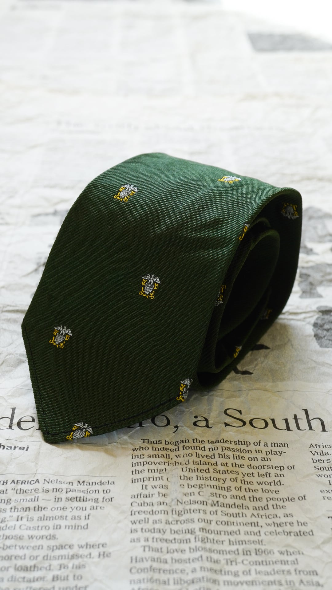 シルク100%の光沢がある生地で作られたイーグル&シールド柄のネクタイで、ベースカラーはグリーンになります。