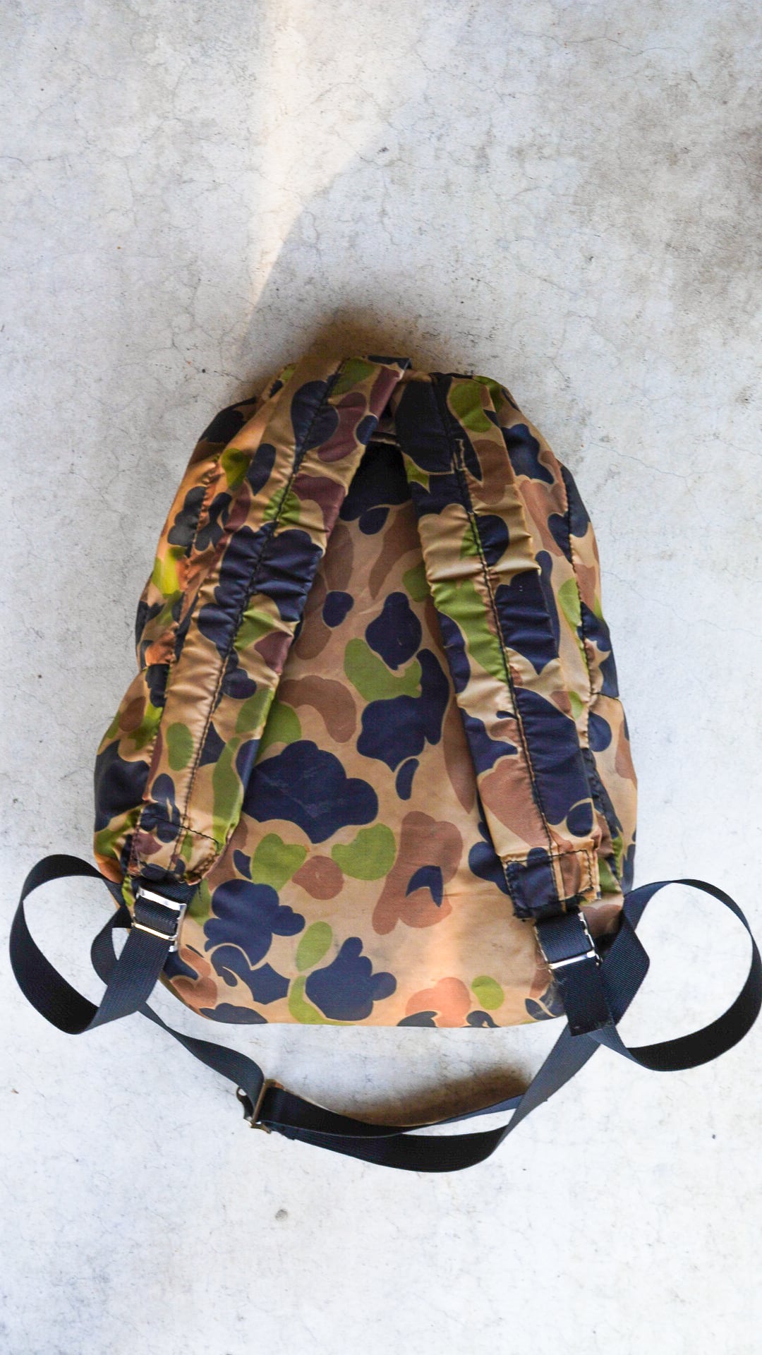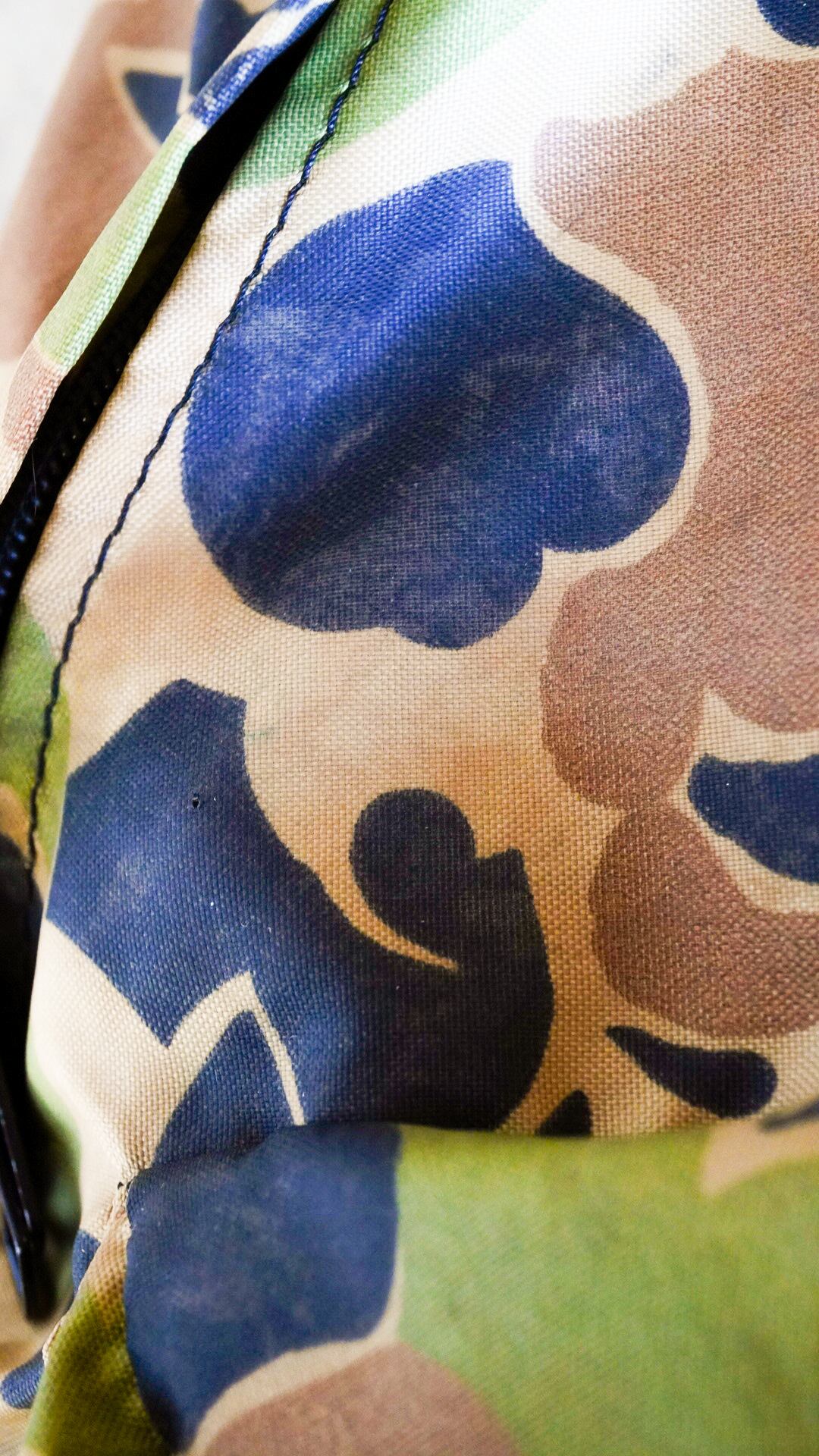 コーディネートのアクセントとなるダックハンターカモ柄が魅力的なOUTDOOR PRODUCTS製のヴィンテージバックパック。