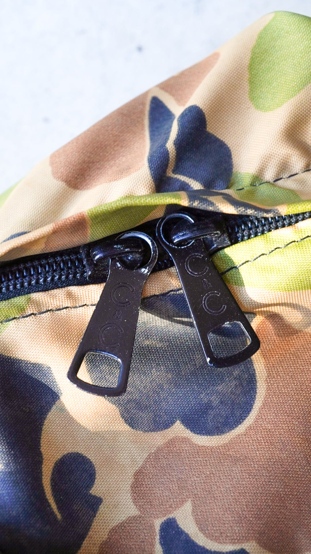 バックパックの中は、1970年代のアウトドア系アイテム等でよく使われているC&Cのダブルジッパーで開閉する仕様で、口も大きく開くので、荷物の出し入れが容易にできます。