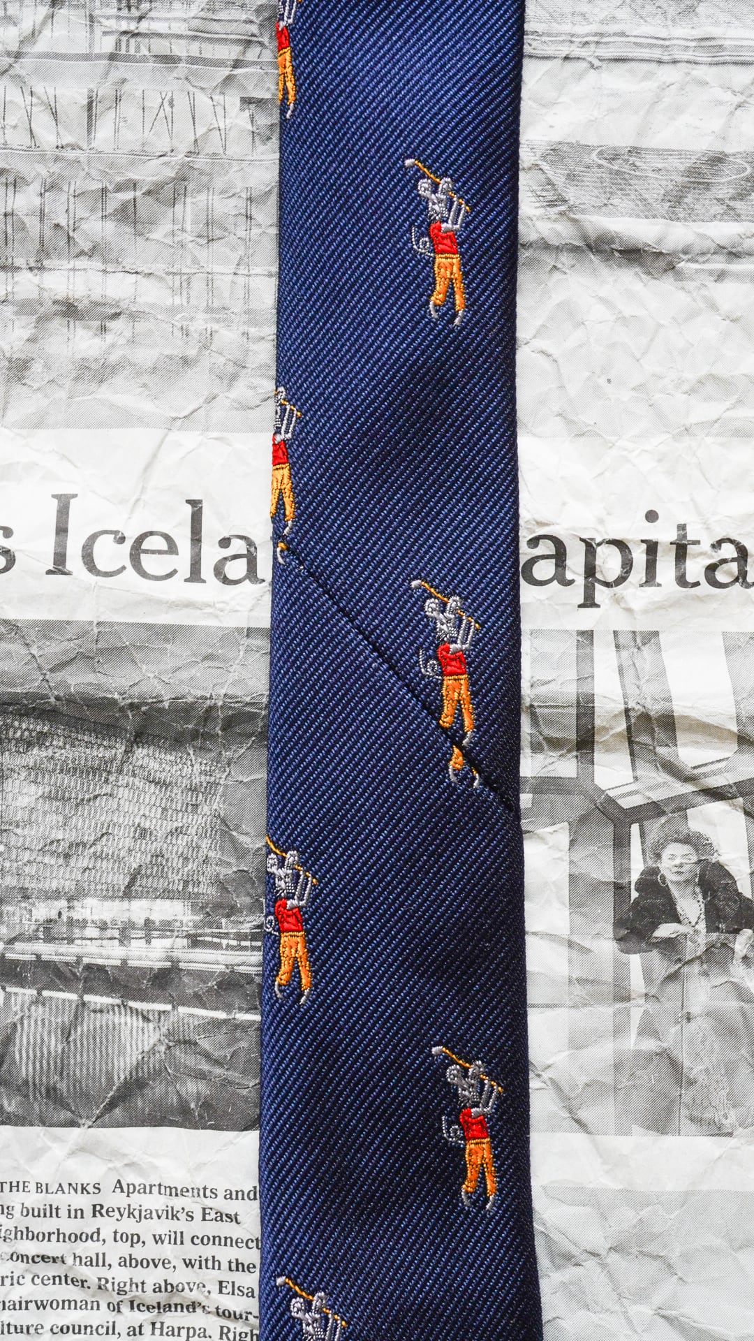 シルク混(シルク65%、ポリエステル35%)の光沢がある生地で作られたマウスがゴルフをプレイしている柄のネクタイです。