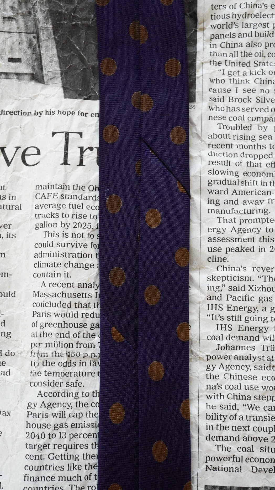シルク100%の光沢がある生地で作られた定番のドット柄のネクタイで、カラーはネイビー×ブラウンの配色になります。