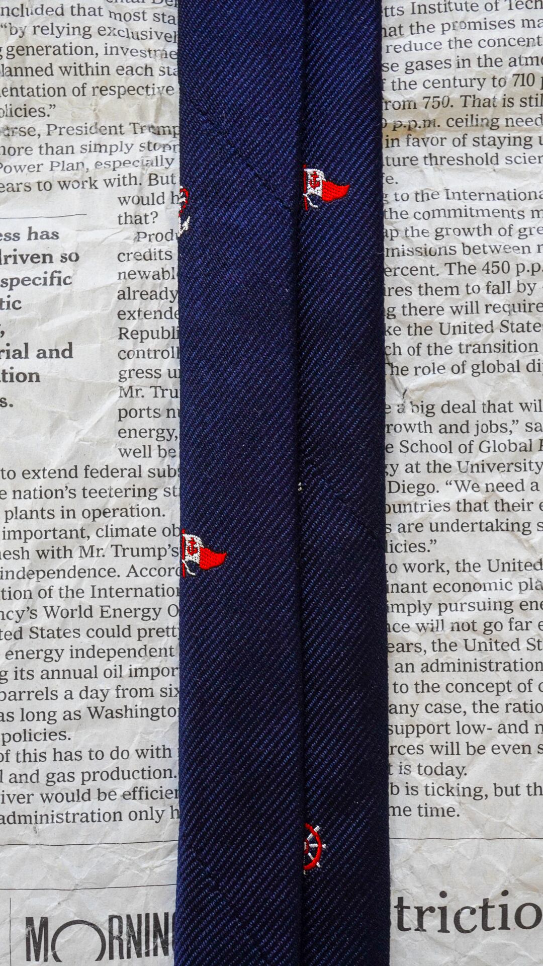 シルク混(シルク65%、ポリエステル35%)の光沢がある生地で作られたアンカー、シップホイール、フラッグ、灯台が刺繍されたマリン柄のネクタイで、ベースカラーはネイビーになります。