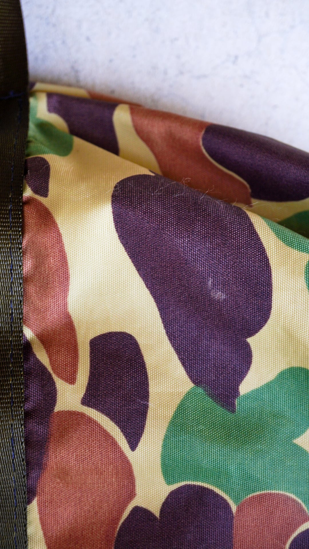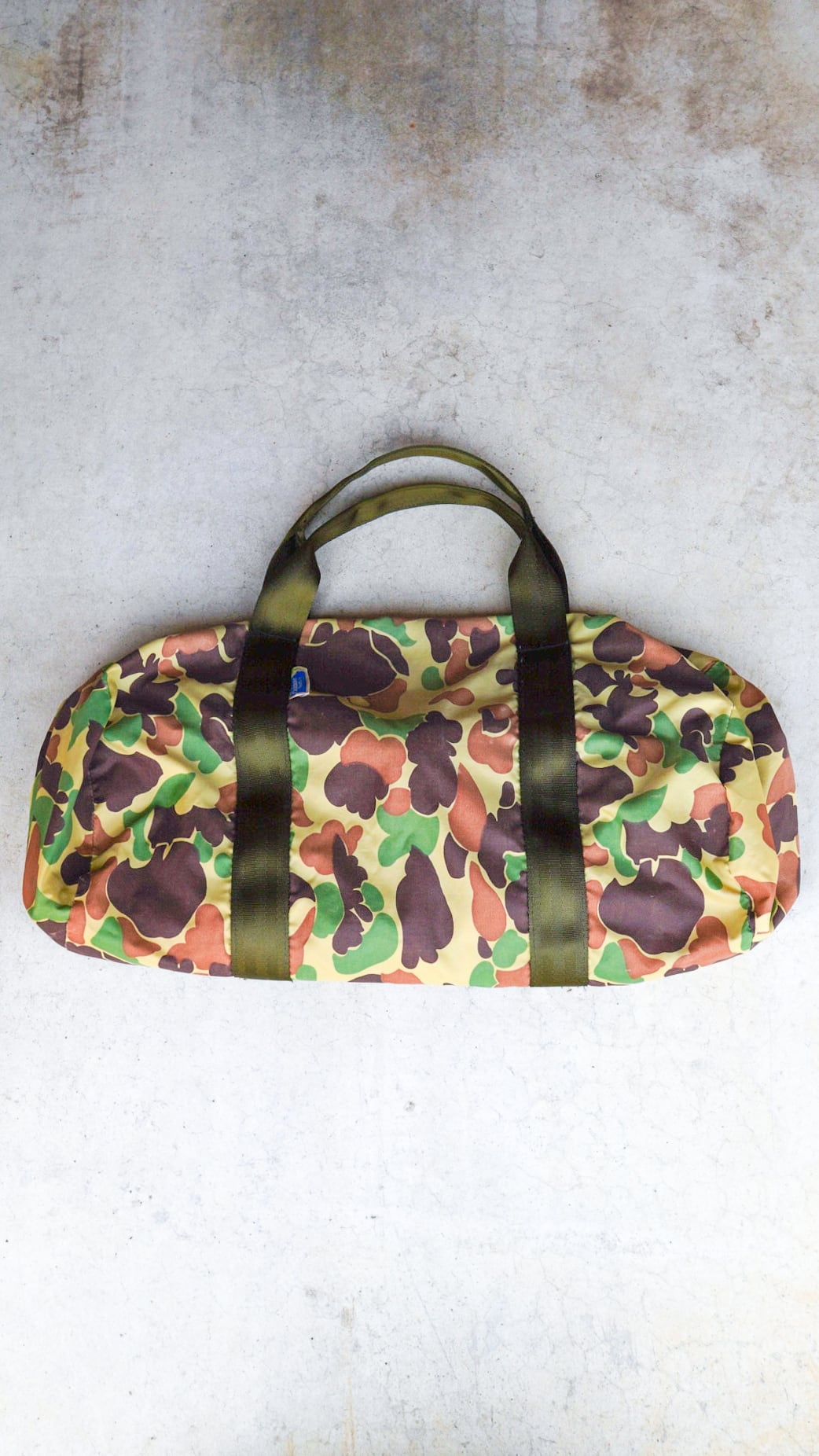 コーディネートのアクセントとなるダックハンターカモ柄が魅力的なOUTDOOR PRODUCTS製のヴィンテージボストンバッグ。