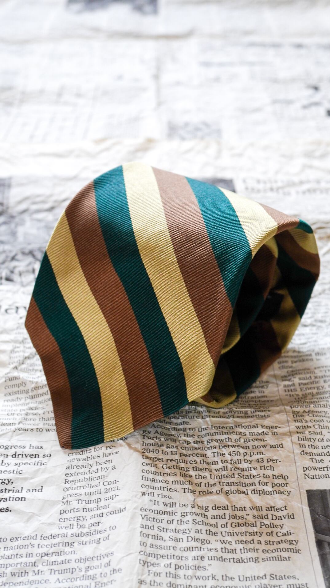 シルク100%の光沢がある生地で作られた定番のレジメンタルストライプ柄のネクタイで、カラーはグリーン×ベージュ×ブラウンのあまり見掛けることのない珍しい配色になります。