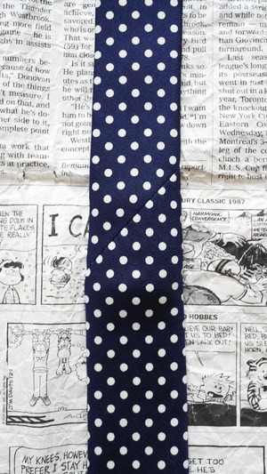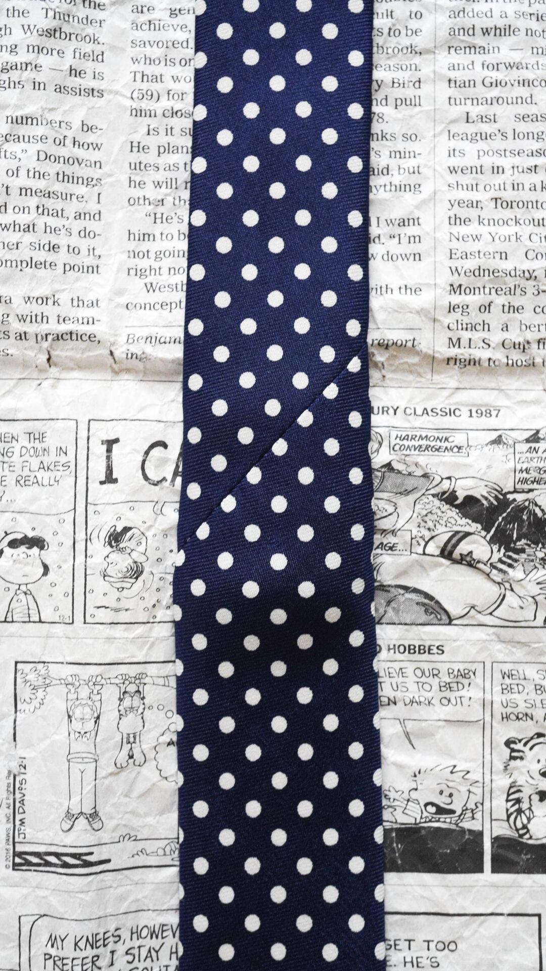 シルク100%の光沢がある生地で作られた定番のドット柄のネクタイで、カラーはネイビー×ホワイトの配色になります。
