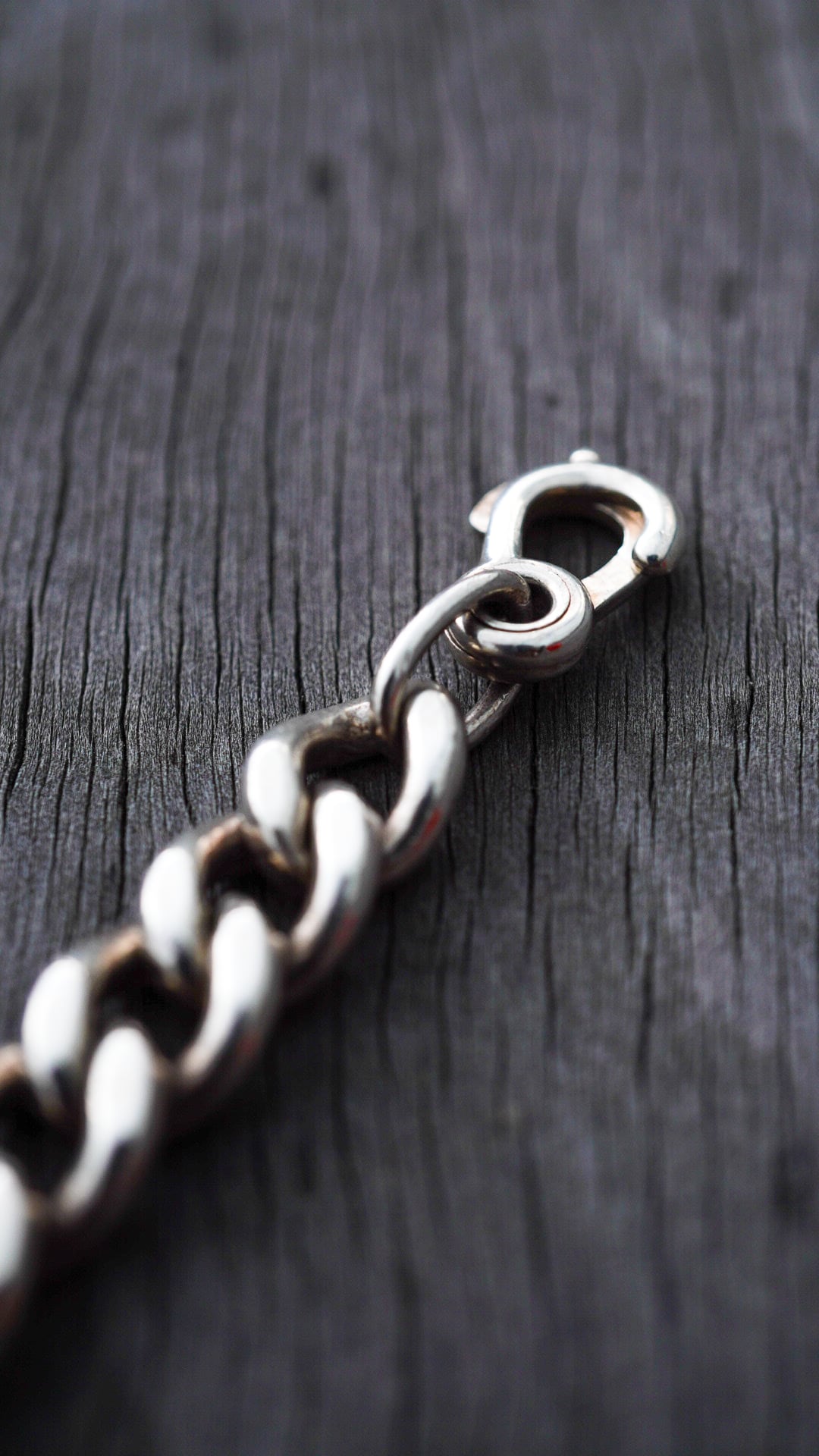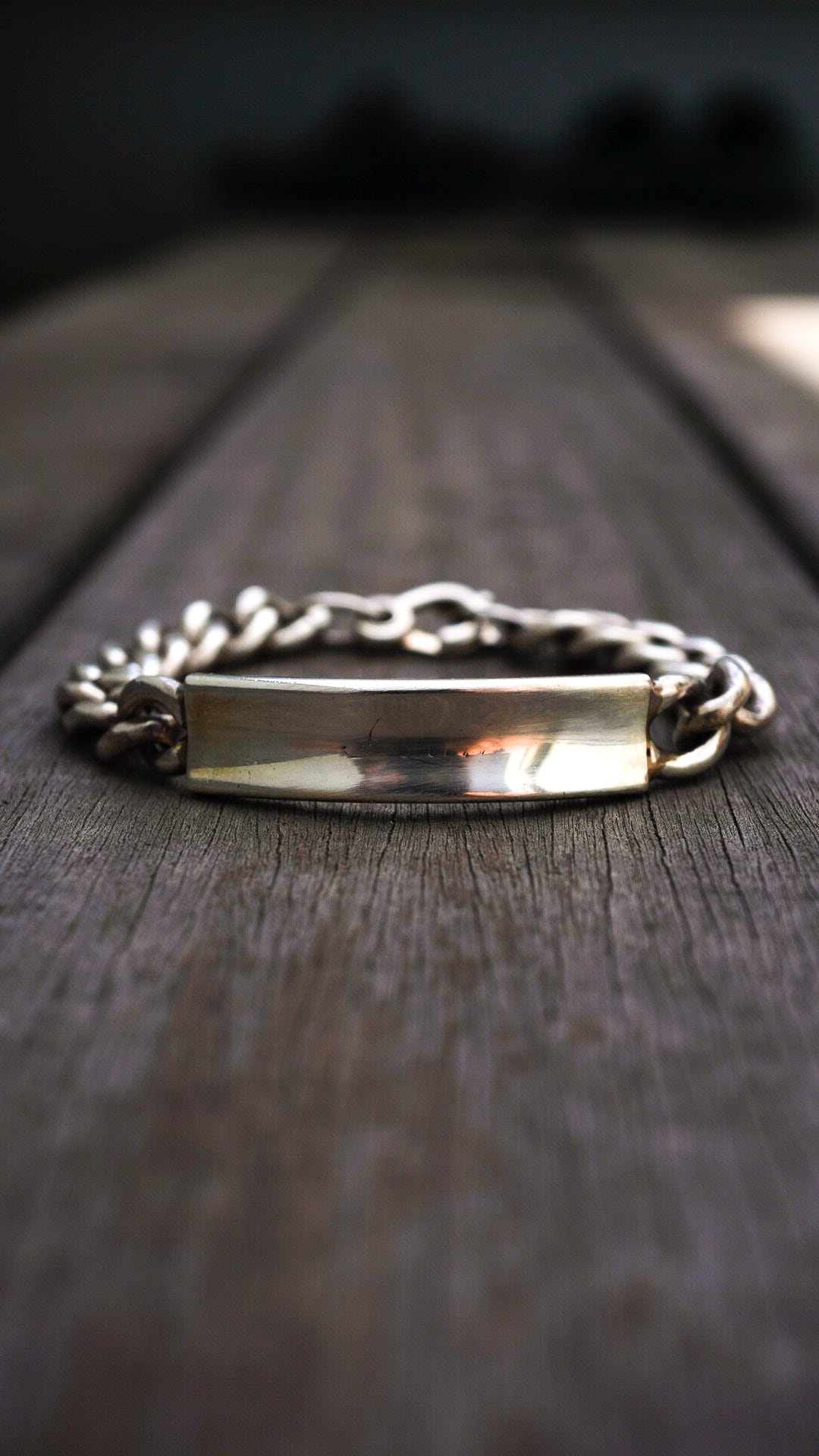 上下辺から中央にかけて滑らかに湾曲したカーブデザインのIDプレート、丸みを帯びた喜平チェーン、古い年代のミリタリーIDブレスレット等に見られる挟み込むクラスプ等、このモデルならではの魅力的なディティールが盛り込まれたクラシカルな1本です。
