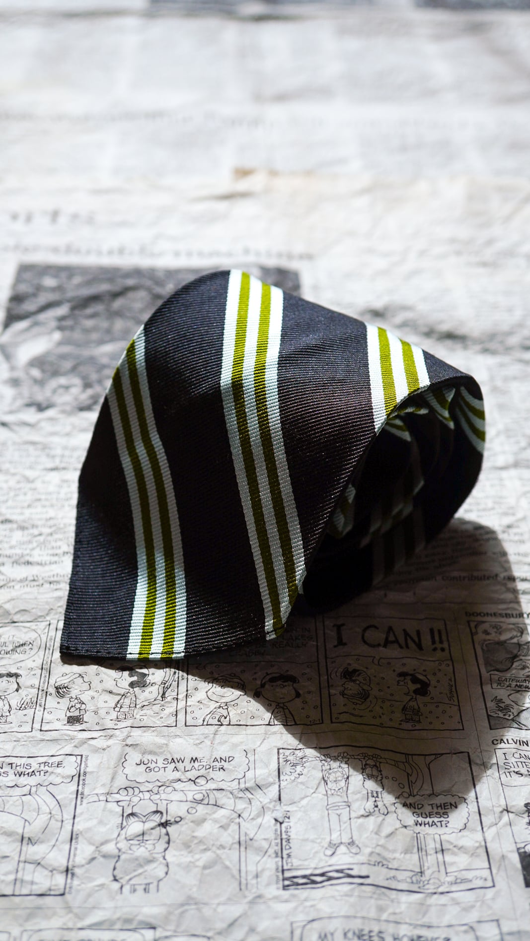 シルク100%の光沢がある生地で作られた定番のレジメンタルストライプ柄のネクタイで、カラーはダークネイビー×ライトグリーン×ホワイトの配色になります。