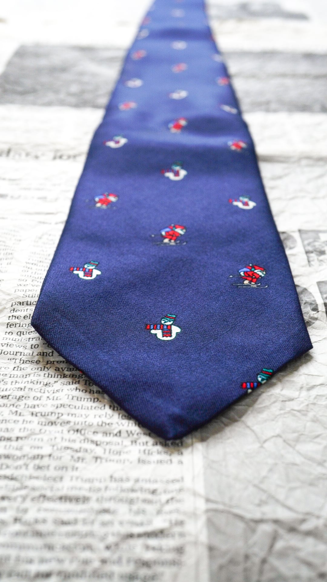 シルク100%の光沢がある生地で作られたスキーをしているサンタクロース&雪だるま柄のネクタイで、ベースカラーはネイビーになります。