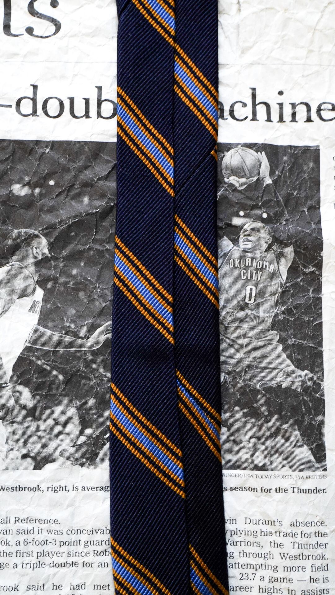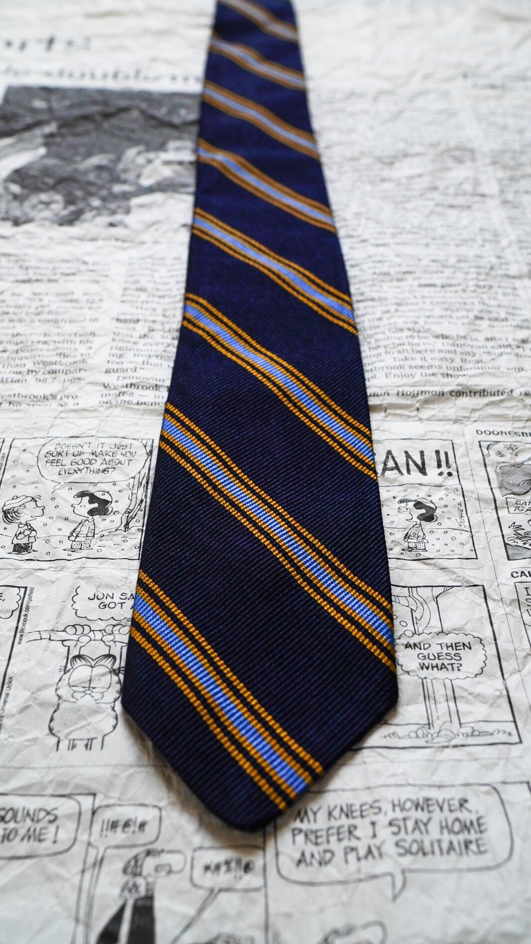 シルク100%の光沢がある生地で作られた定番のレジメンタルストライプ柄のネクタイで、カラーはネイビー×ブルー×ゴールドの配色になります。
