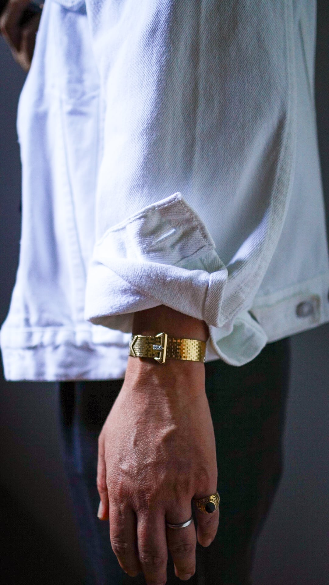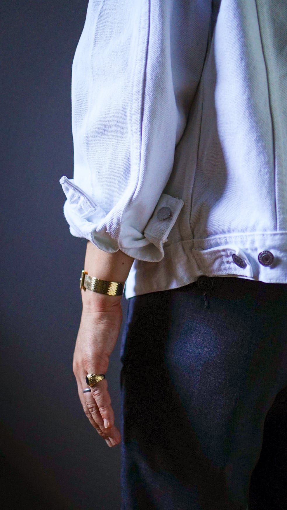 幅は約1.5cmで40gを超える重量がありますので、このブレスレットを1つ腕に着用するだけでコーディネート全体の印象を大きく変えてくれる存在感があります。