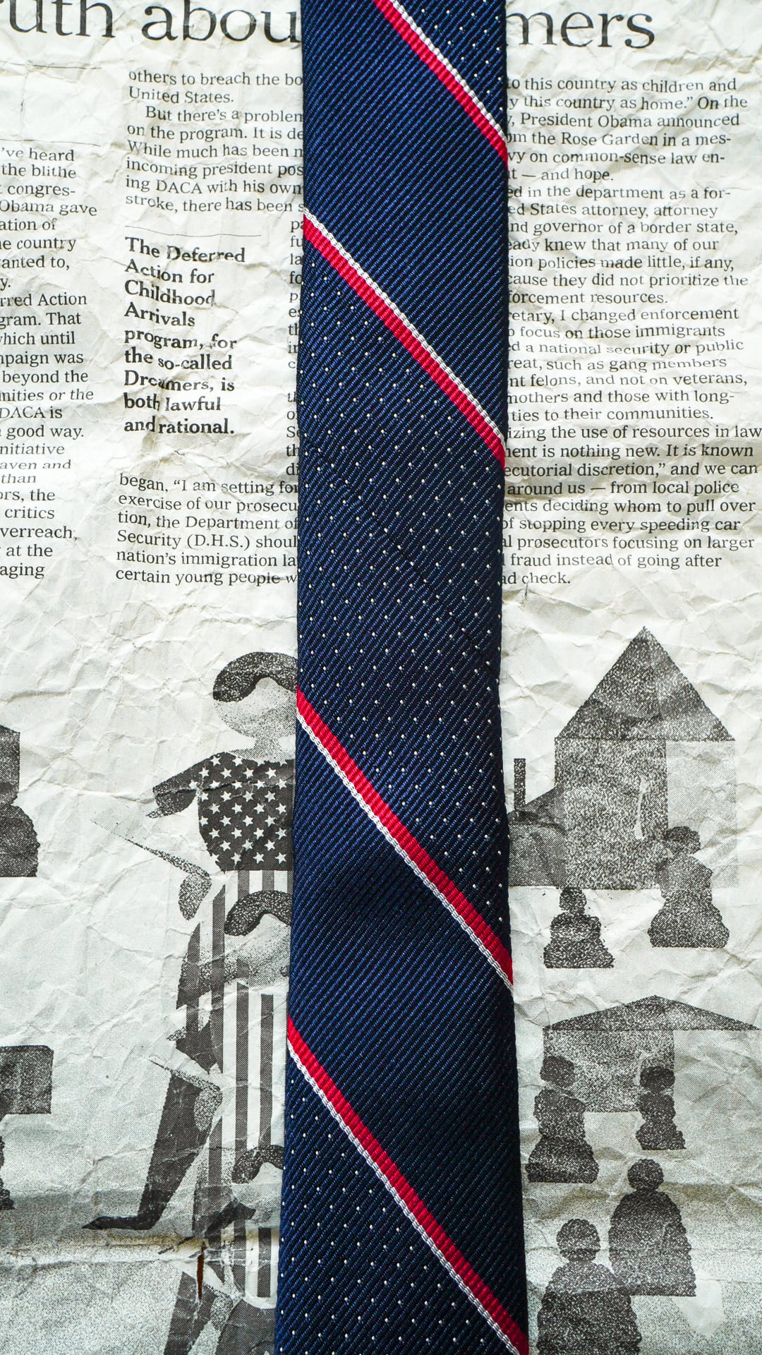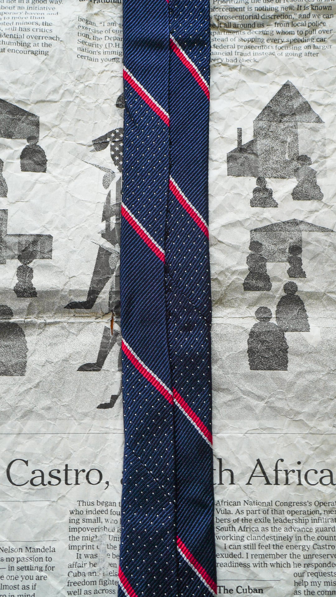 トラッドスタイルの定番である伝統的な右下がりの縞柄は、胸元に清潔感をもたらします。