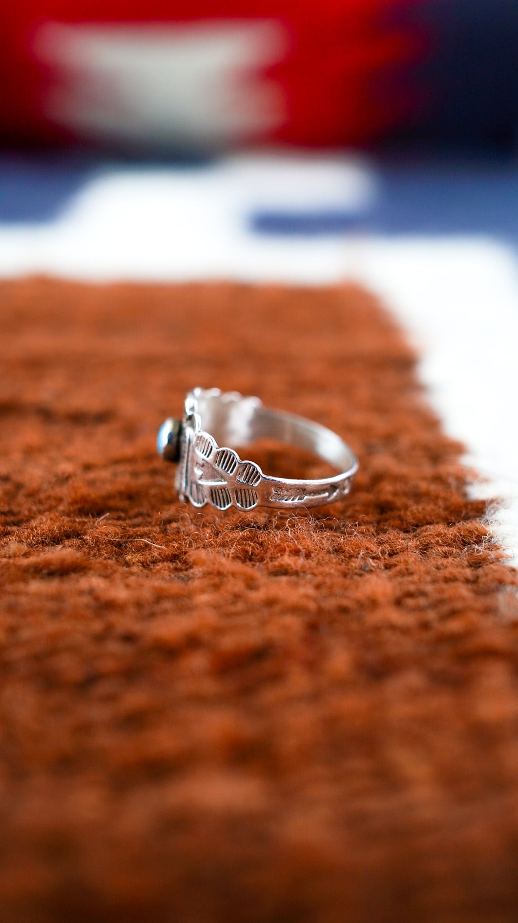 本リングのモチーフに使われている伝説上の鳥サンダーバードは「幸福をもたらす鳥」を意味し、その中央にはターコイズの石がセットされています。