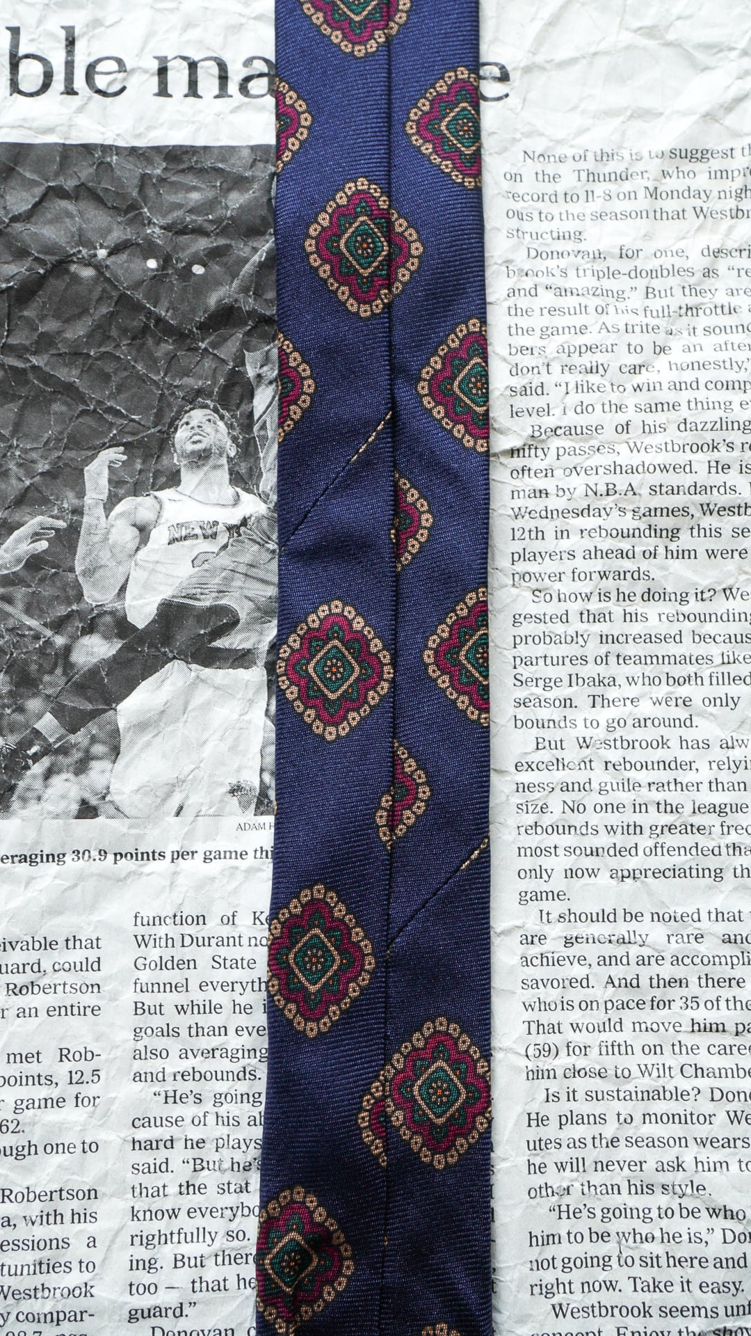 シルク100%の光沢がある生地で作られた小紋柄のネクタイで、ベースカラーはネイビーになります。