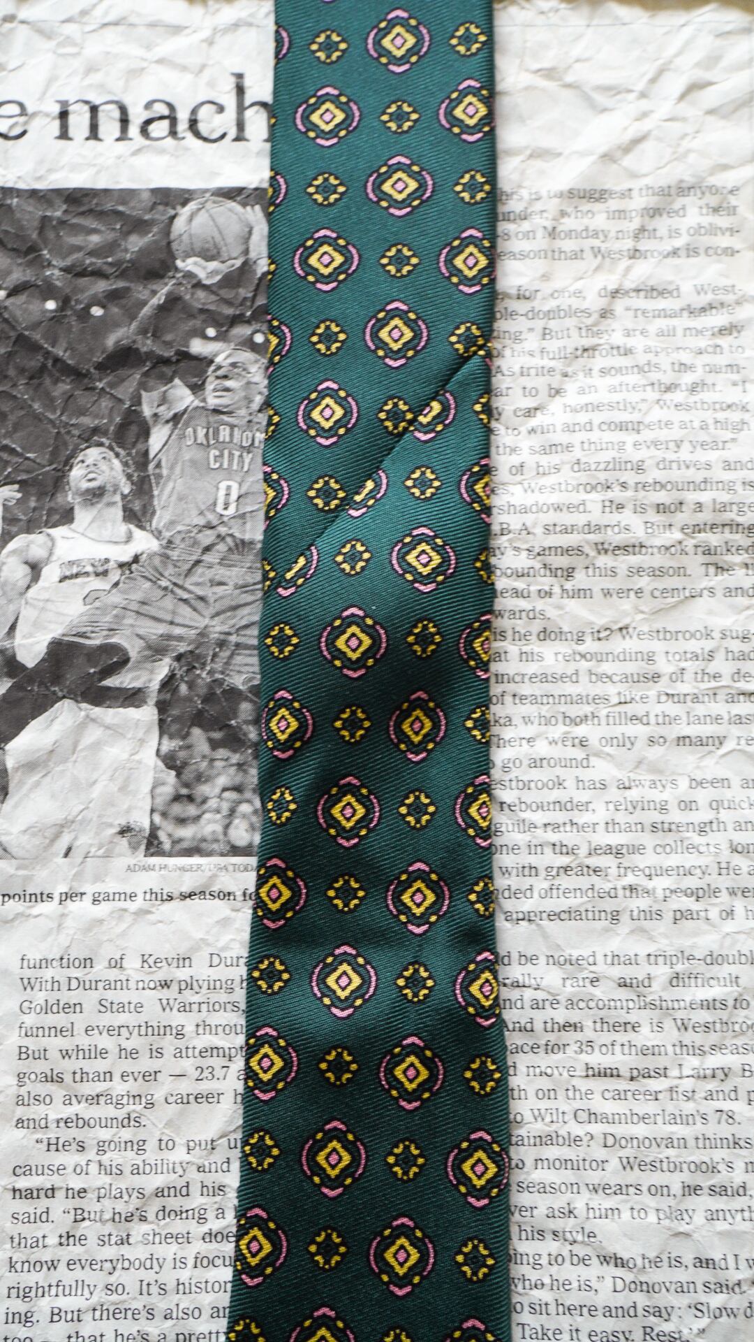 シルク100%の光沢がある生地で作られた小紋柄のネクタイで、ベースカラーはグリーンになります。