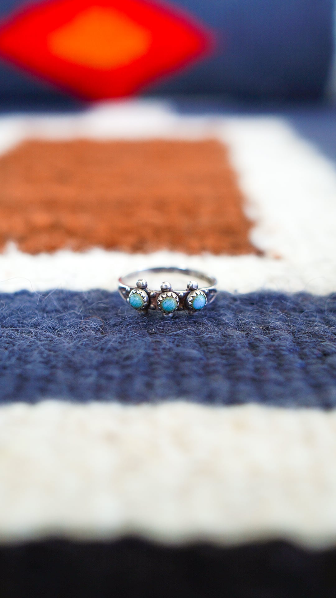 3連のターコイズが特徴的なリングで、流麗で奥行きのあるデザインがターコイズをより際立たせているかと思います。