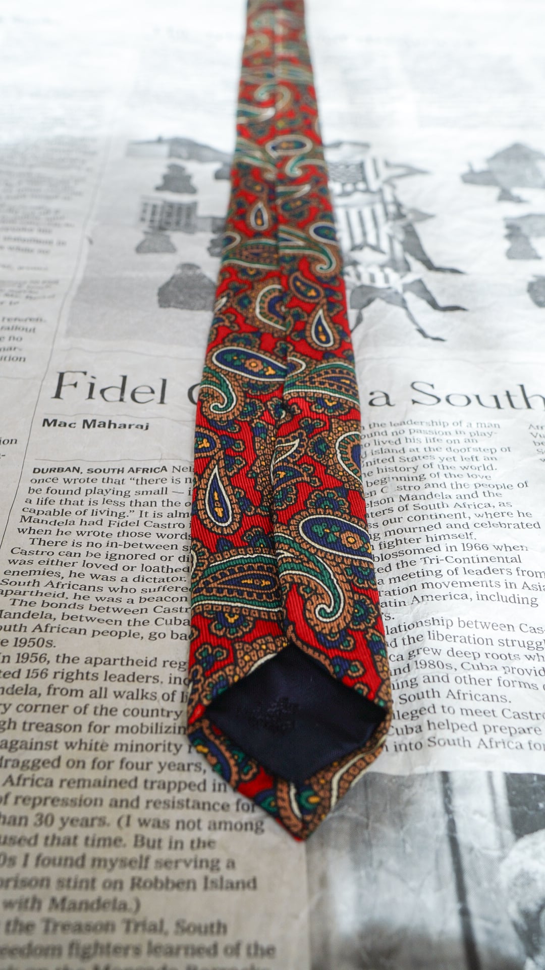 シルク100%の光沢がある生地で作られたペイズリー柄のネクタイで、ベースカラーはレッドになります。