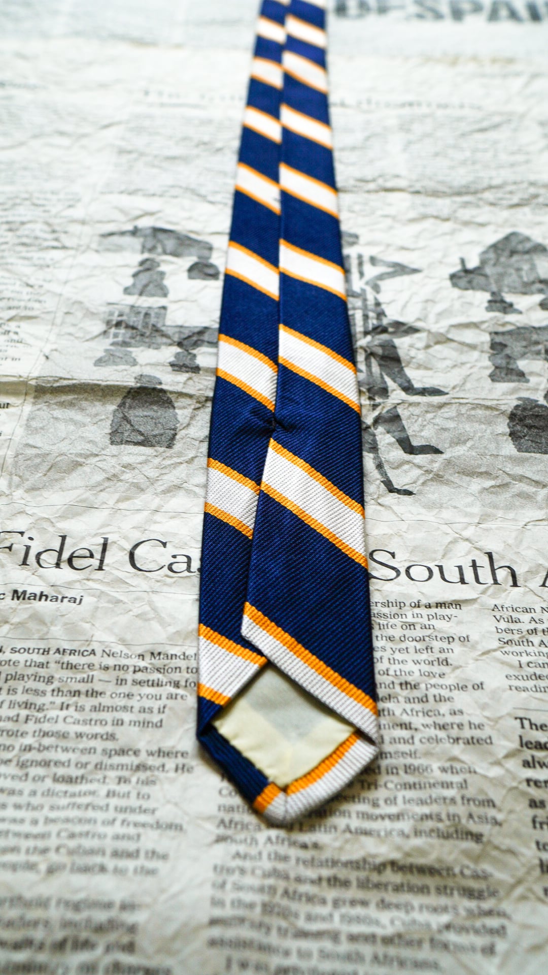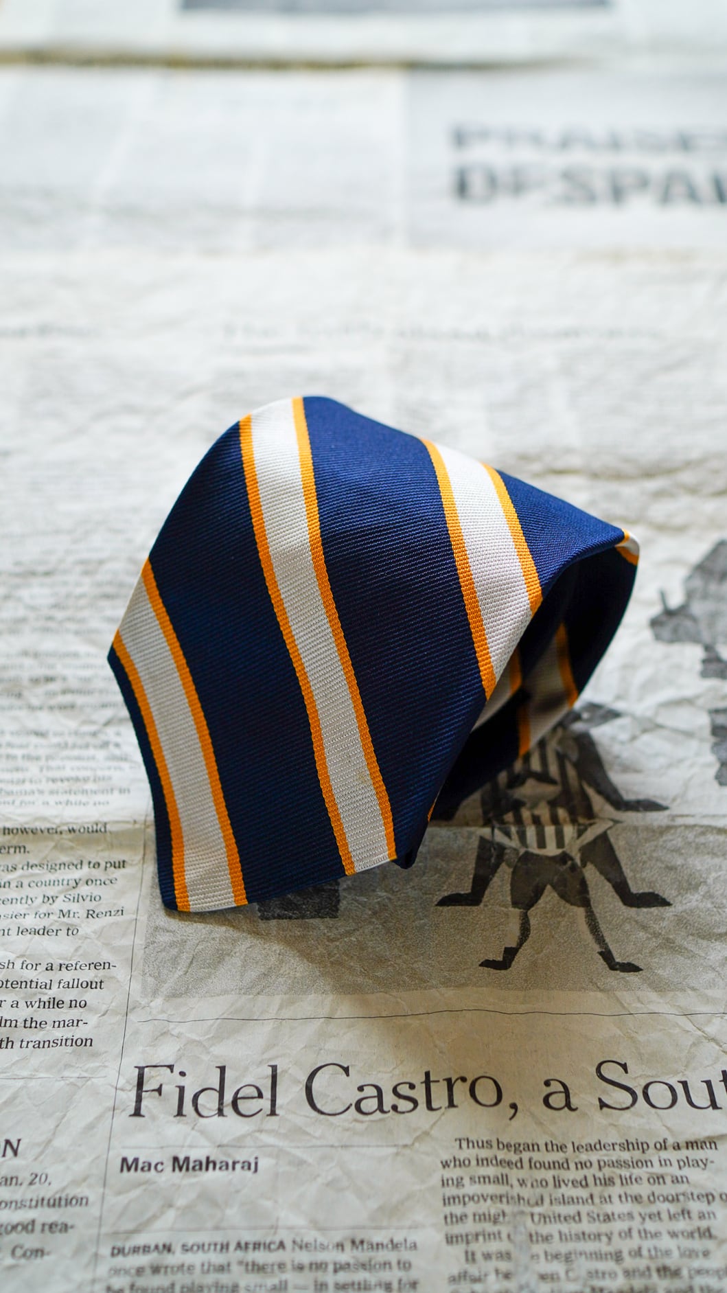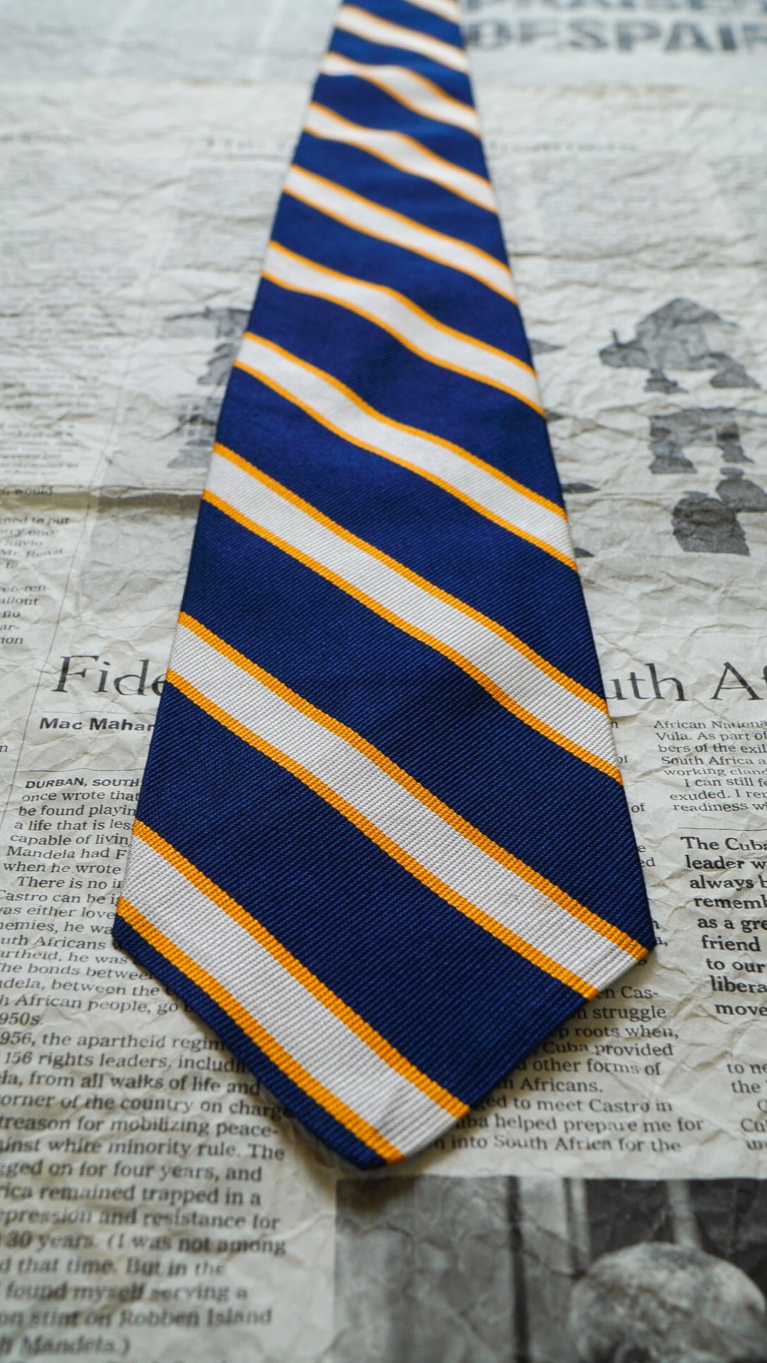 シルク100%の光沢がある生地で作られた定番のレジメンタルストライプ柄のネクタイで、カラーはネイビー×ホワイト×イエローの配色になります。