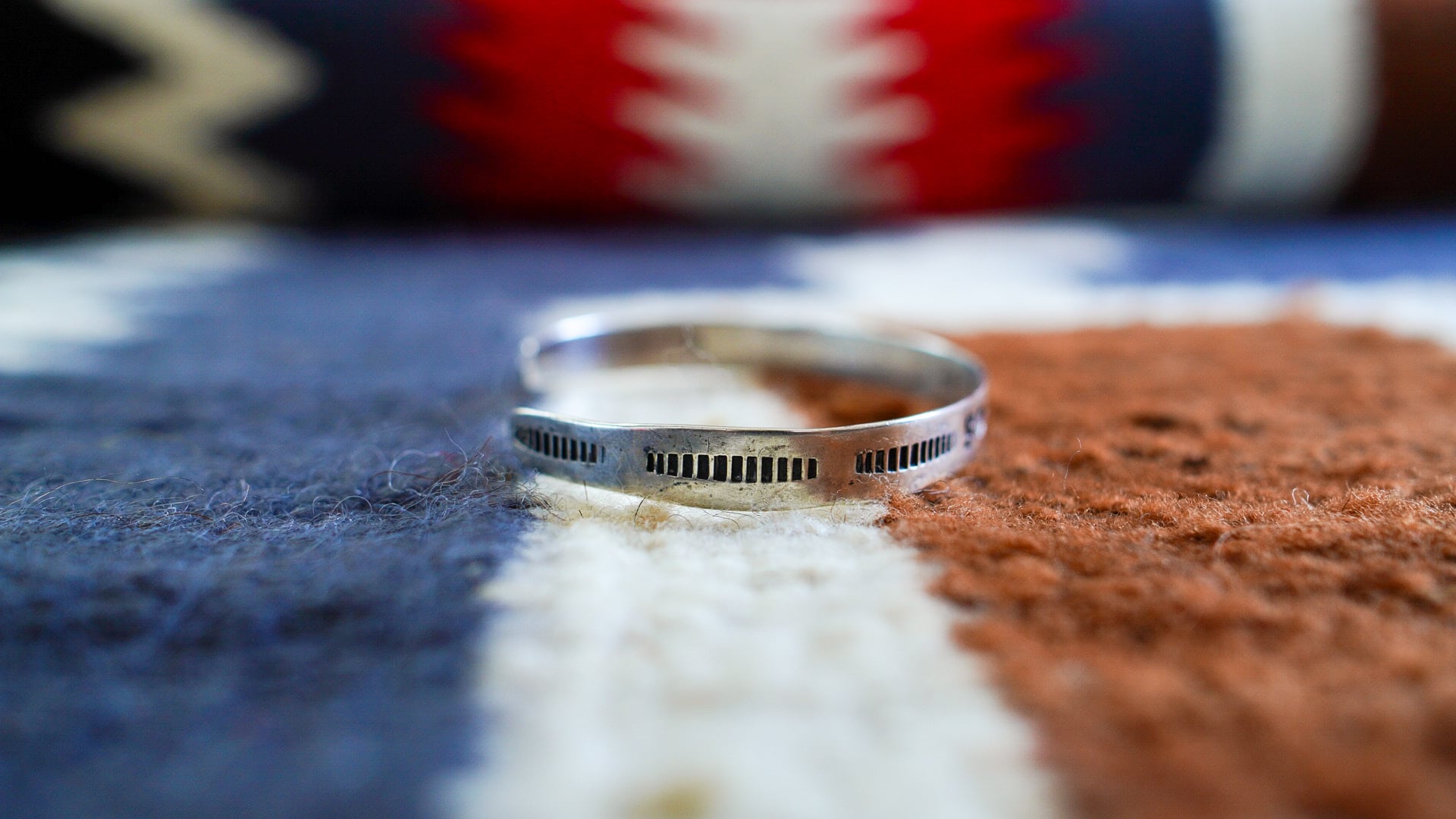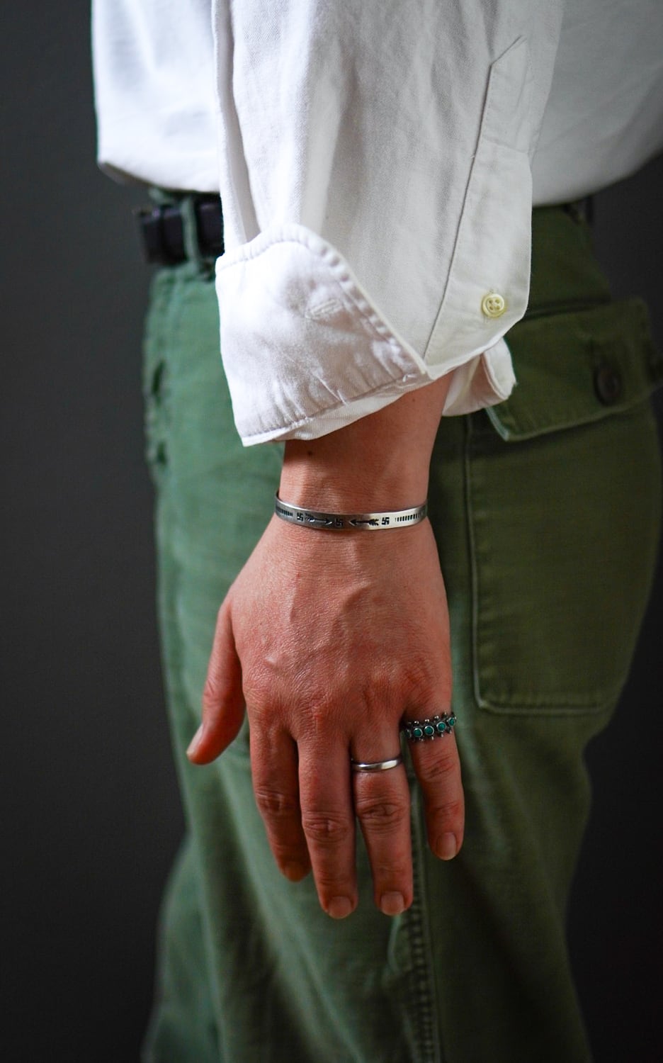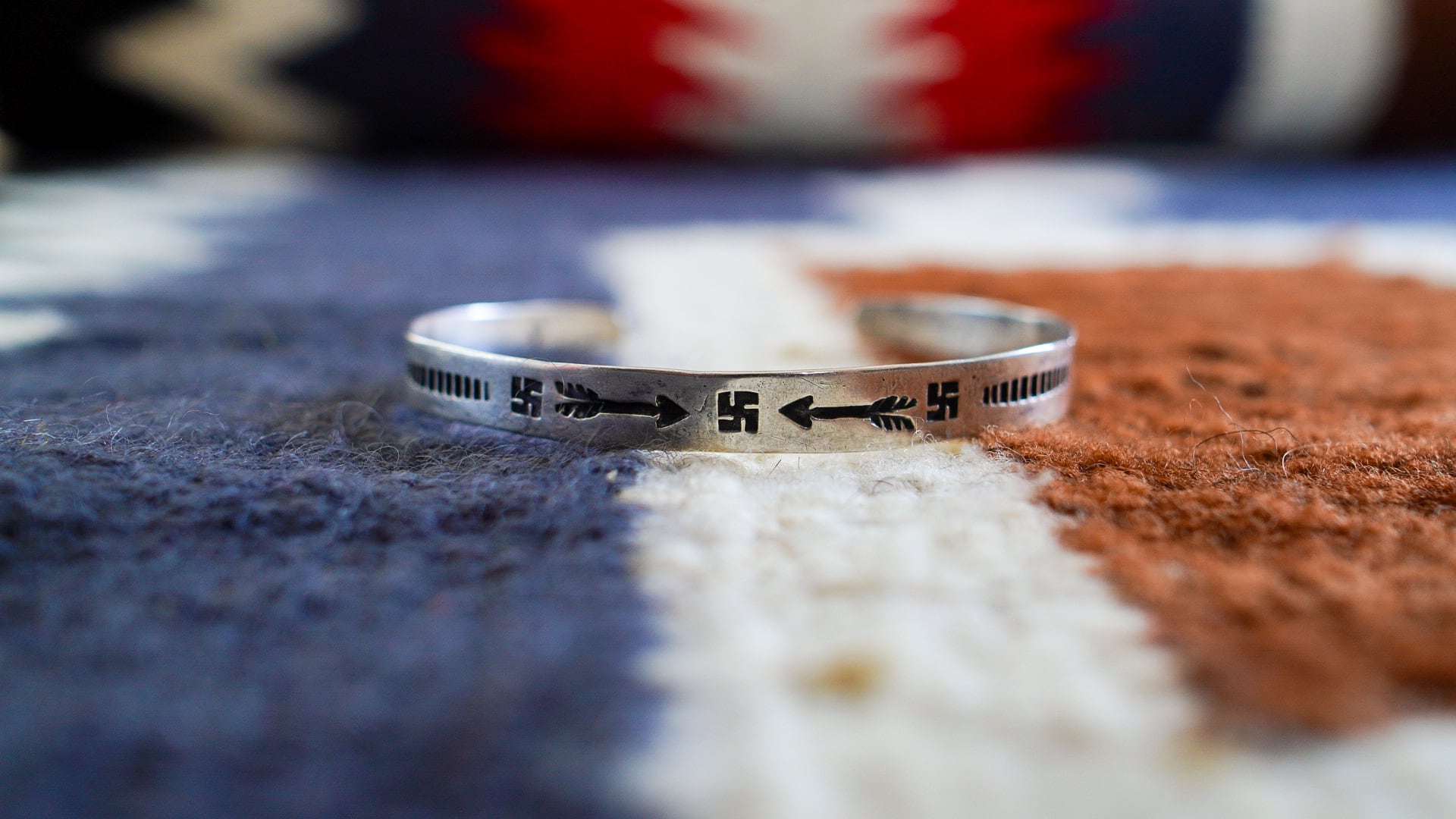 本バングルには、ネイティブアメリカンたちのシンボルであるスワスティカが3つあしらわれています。