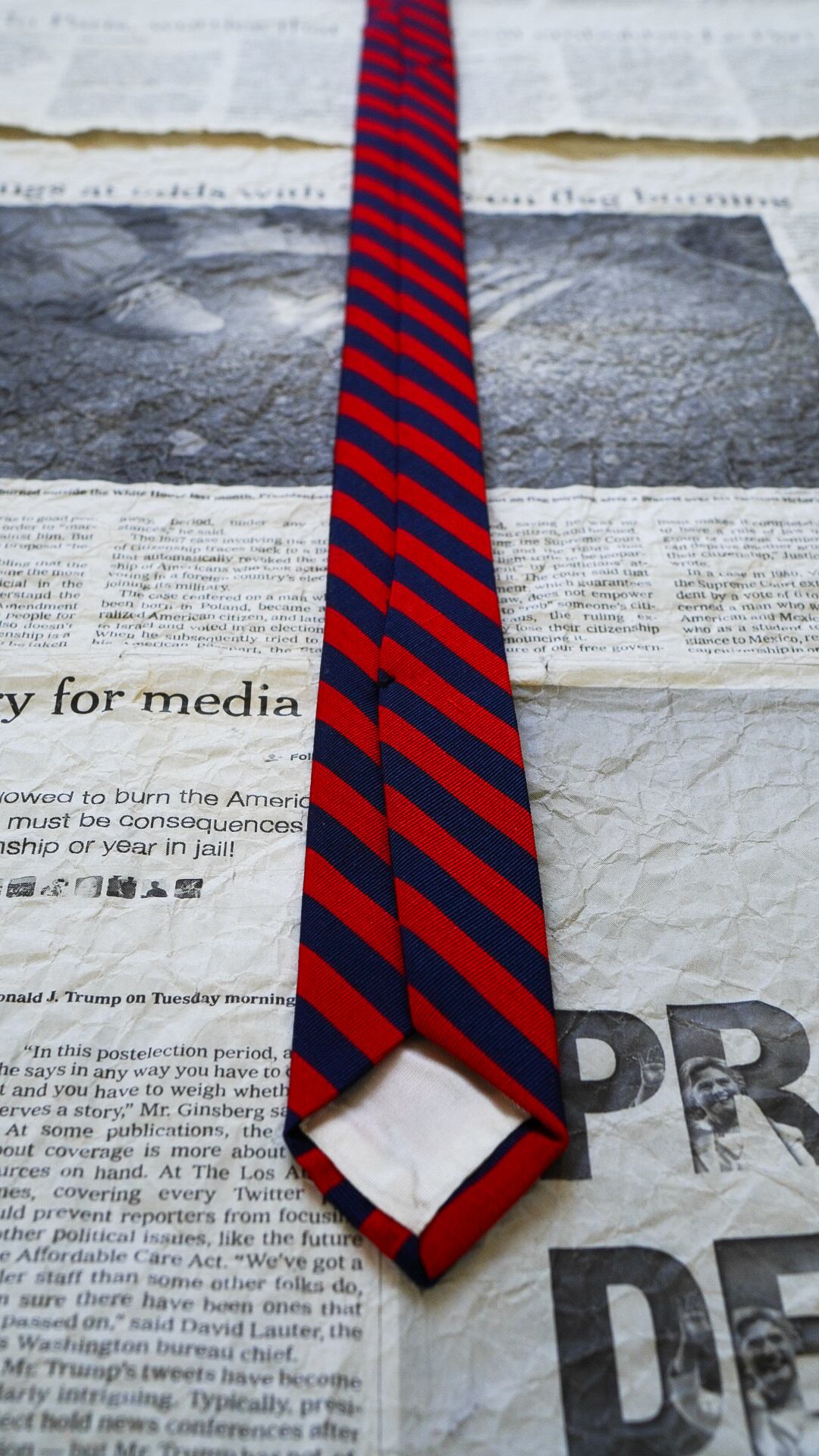 胸元に伝統と清潔感をもたらすレジメンタルストライプ柄のネクタイは、アメリカンクラシックには欠かせないマストアイテムです。