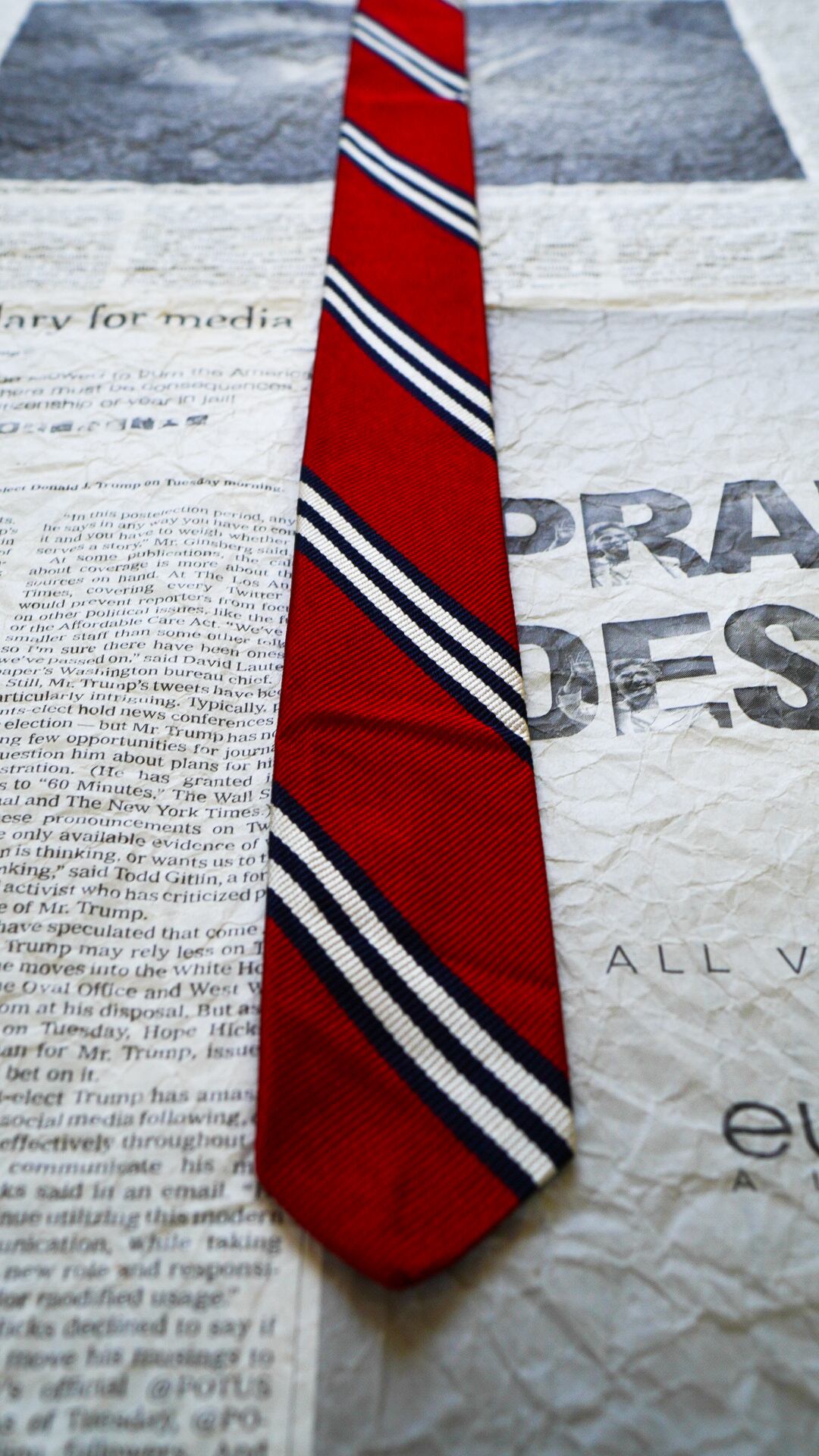 シルク100%の光沢がある生地で作られた定番のレジメンタルストライプ柄のネクタイで、カラーはレッド×ネイビー×ホワイトの配色になります。