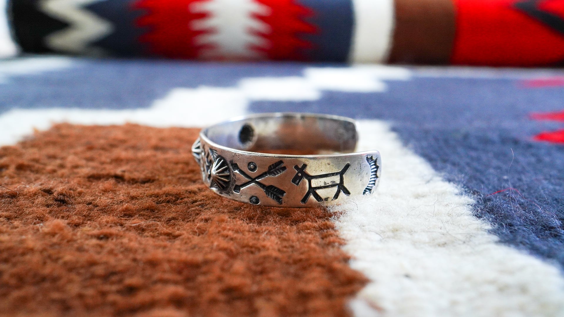 サイドには「友情」を意味するクロスアローや「旅」を意味するホースドッグ等、ナバホのトラディショナルなスタンプワークが施されています。