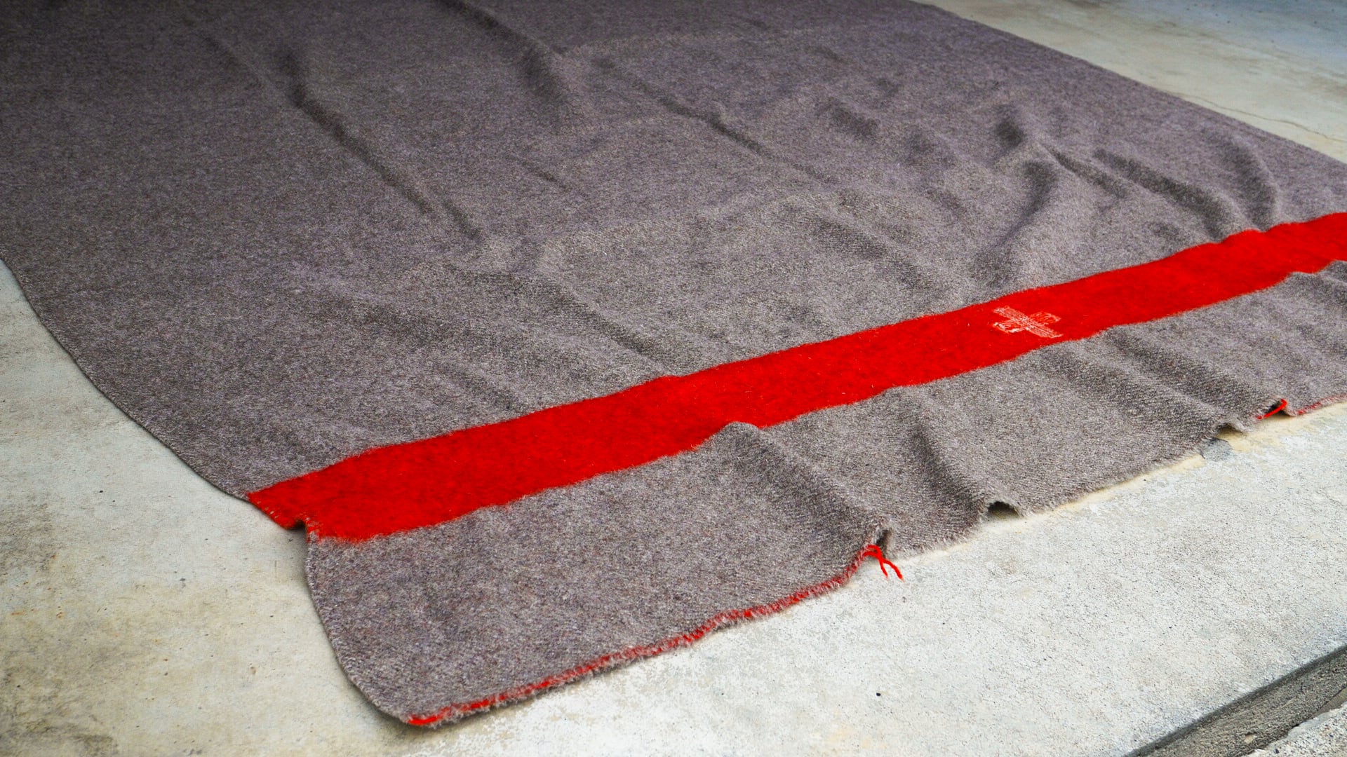 赤色のストライプにスイス軍を表す十字マークが織り込まれたスタイリッシュなデザインが魅力のミリタリーウールブランケット。