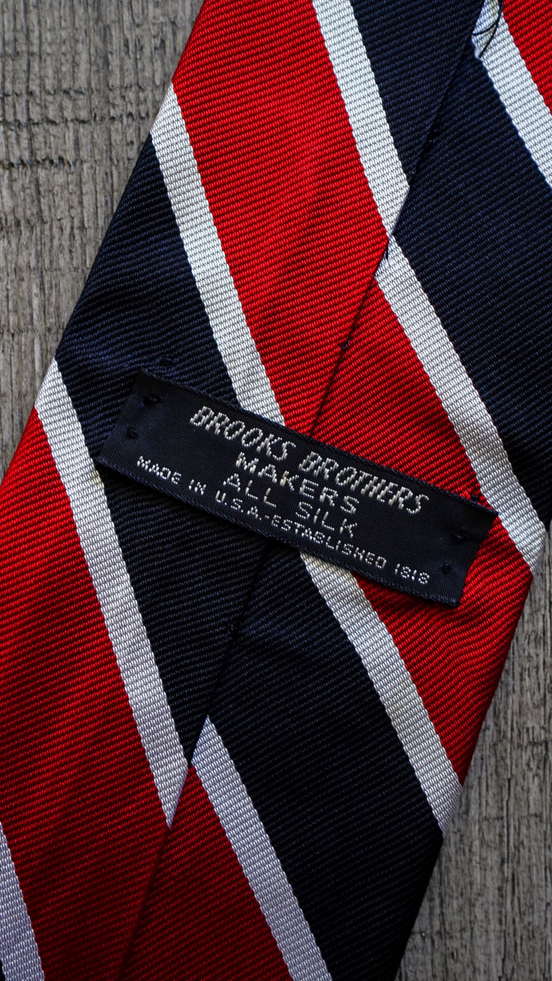 シルク100%の光沢がある生地で作られた定番のレジメンタルストライプ柄のネクタイで、カラーはレッド×ブラック(もしくはブラックに近いダークネイビー)×ホワイトの配色になります。