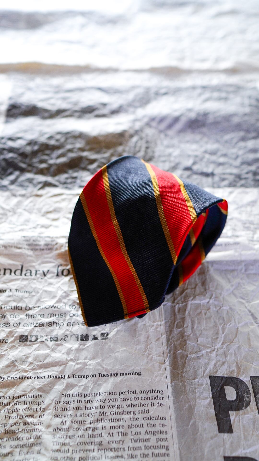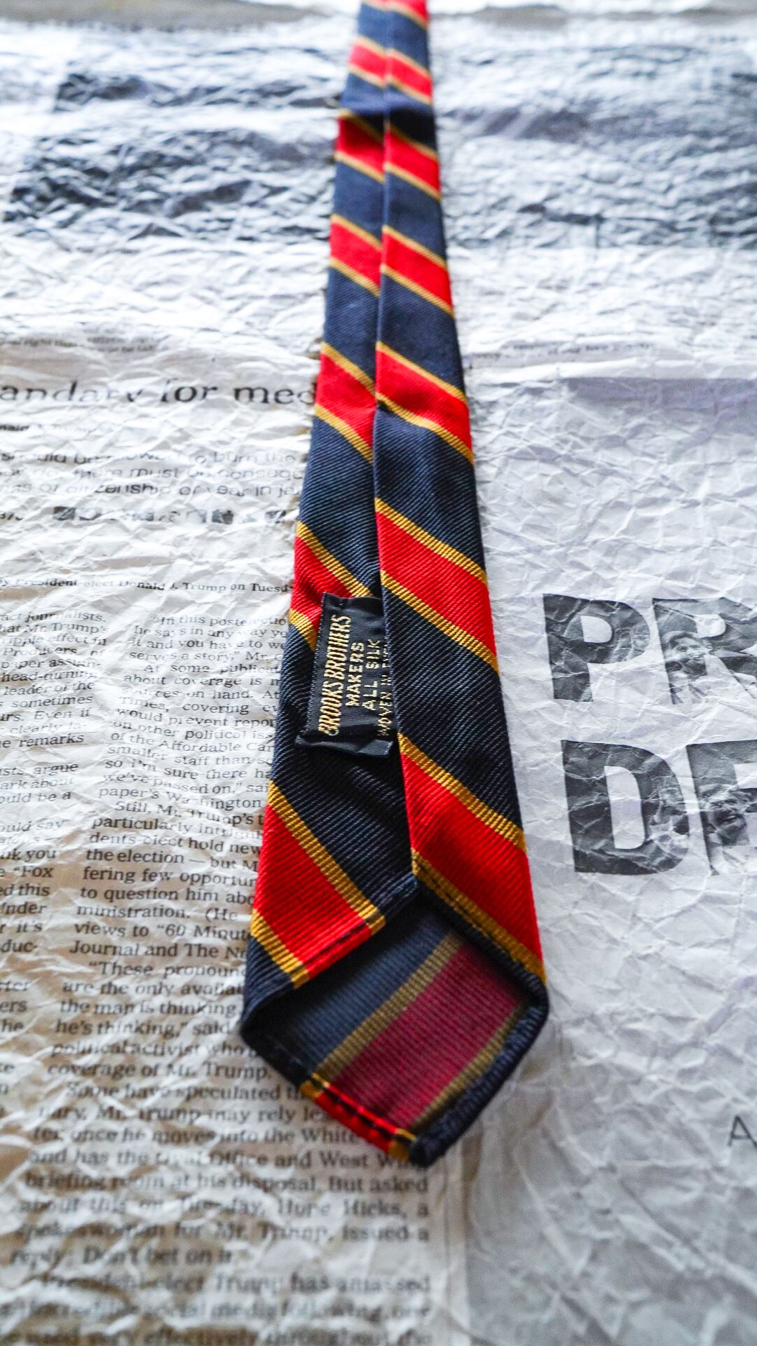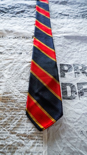 シルク100%の光沢がある生地で作られた定番のレジメンタルストライプ柄のネクタイで、カラーはブラック(もしくはブラックに近いダークネイビー)×レッド×ゴールドの配色になります。