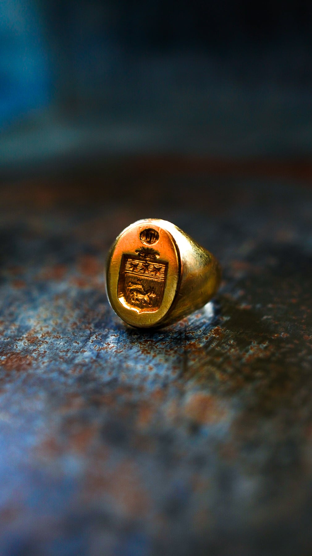 このリングの台座はオーバル型で、リングトップにはデザイン性の高い紋章(クレスト)が深く彫り込まれています。
