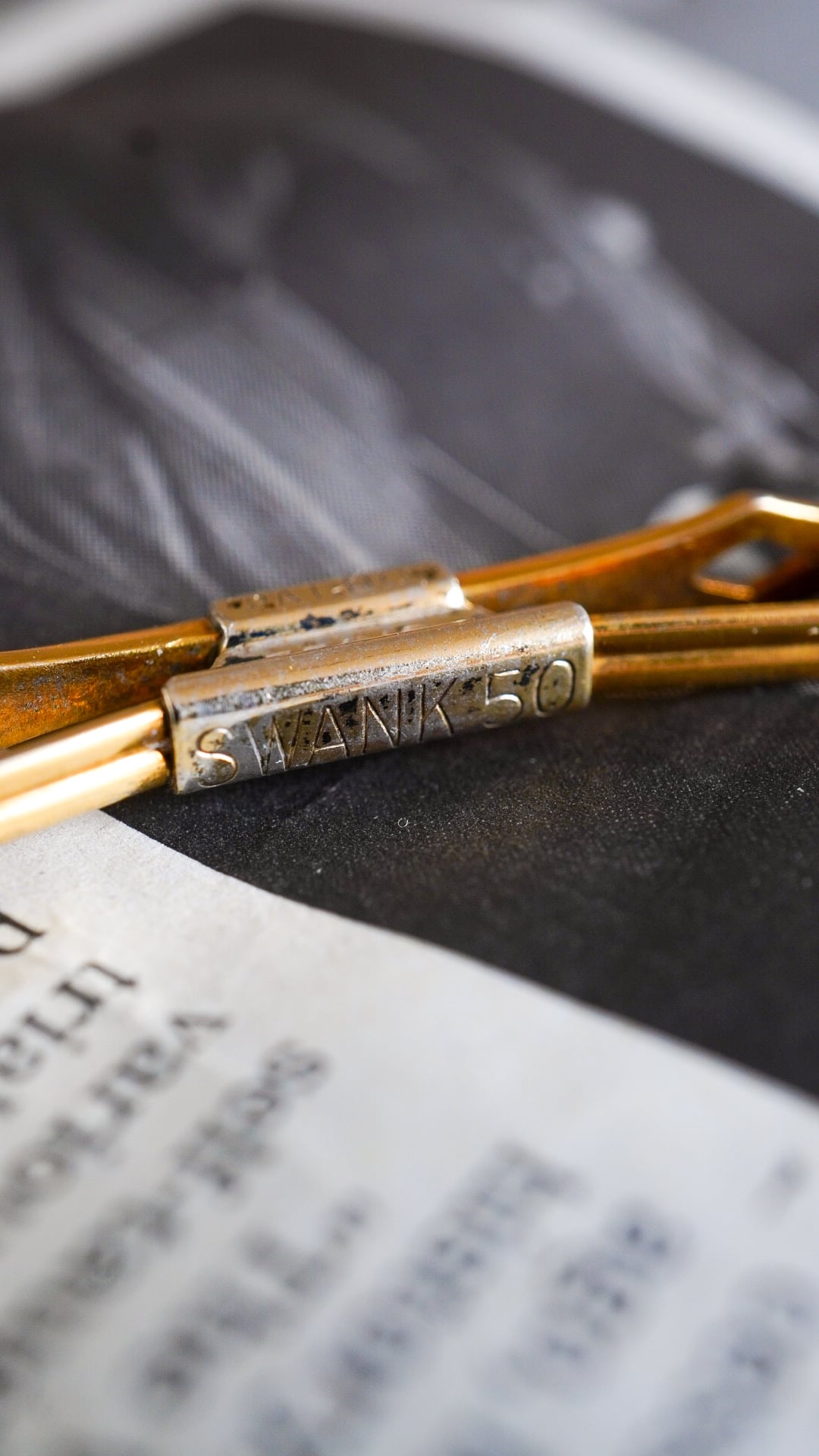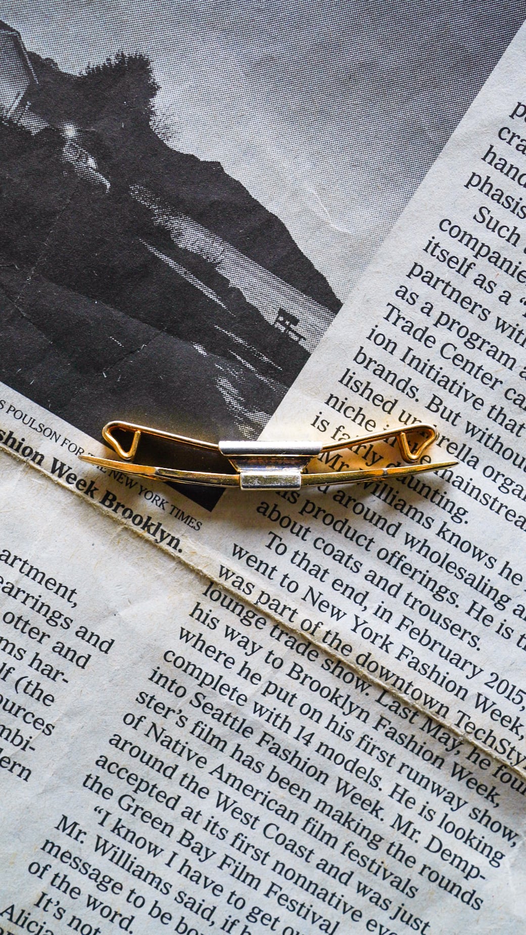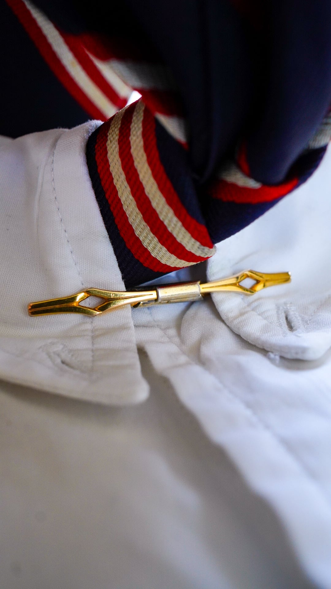そこで、ネクタイ自体を持ち上げて支えることで、結び目が緩まないようにすると同時に、アーチを作ることでVゾーンに立体的な表情を作る用途としてカラーピンが登場した経緯があり、ヴィンテージネクタイとの相性は抜群です。