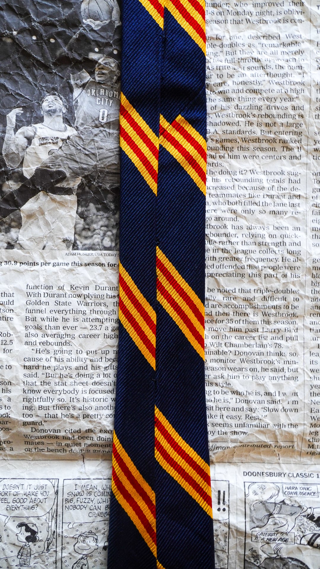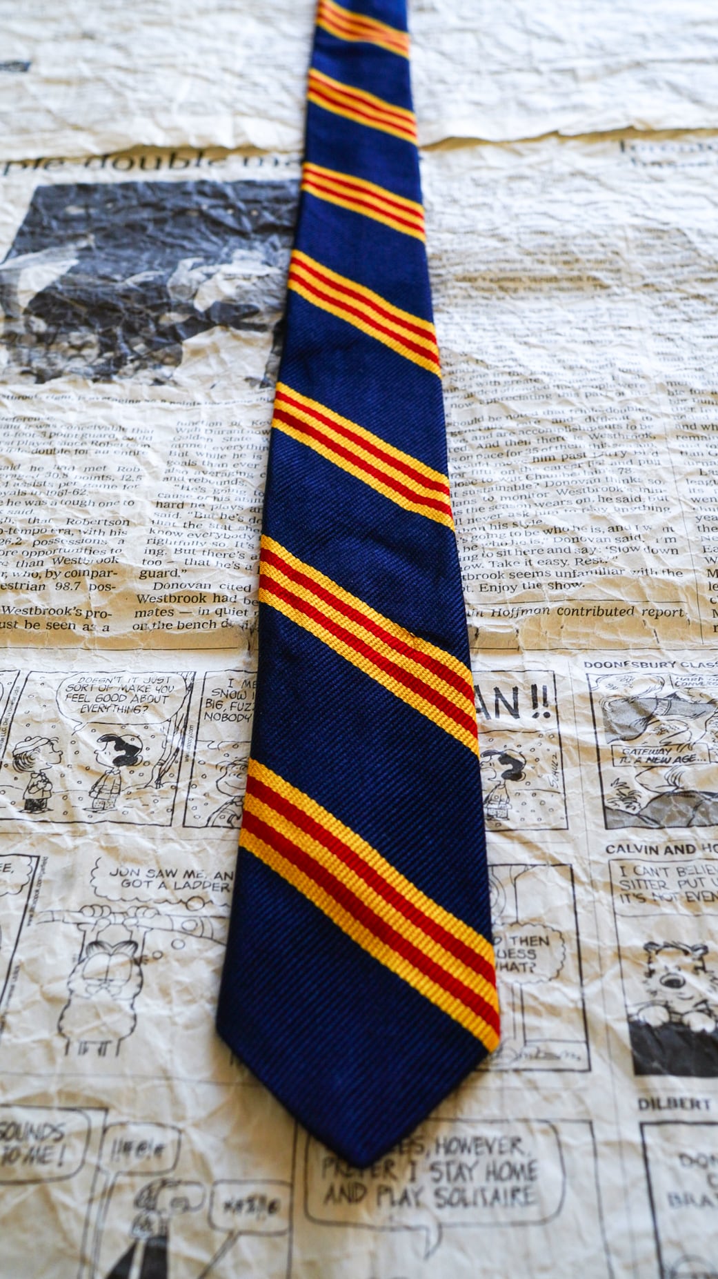 シルク100%の光沢がある生地で作られた定番のレジメンタルストライプ柄のネクタイで、カラーはネイビー×ゴールド×レッドの配色になります。