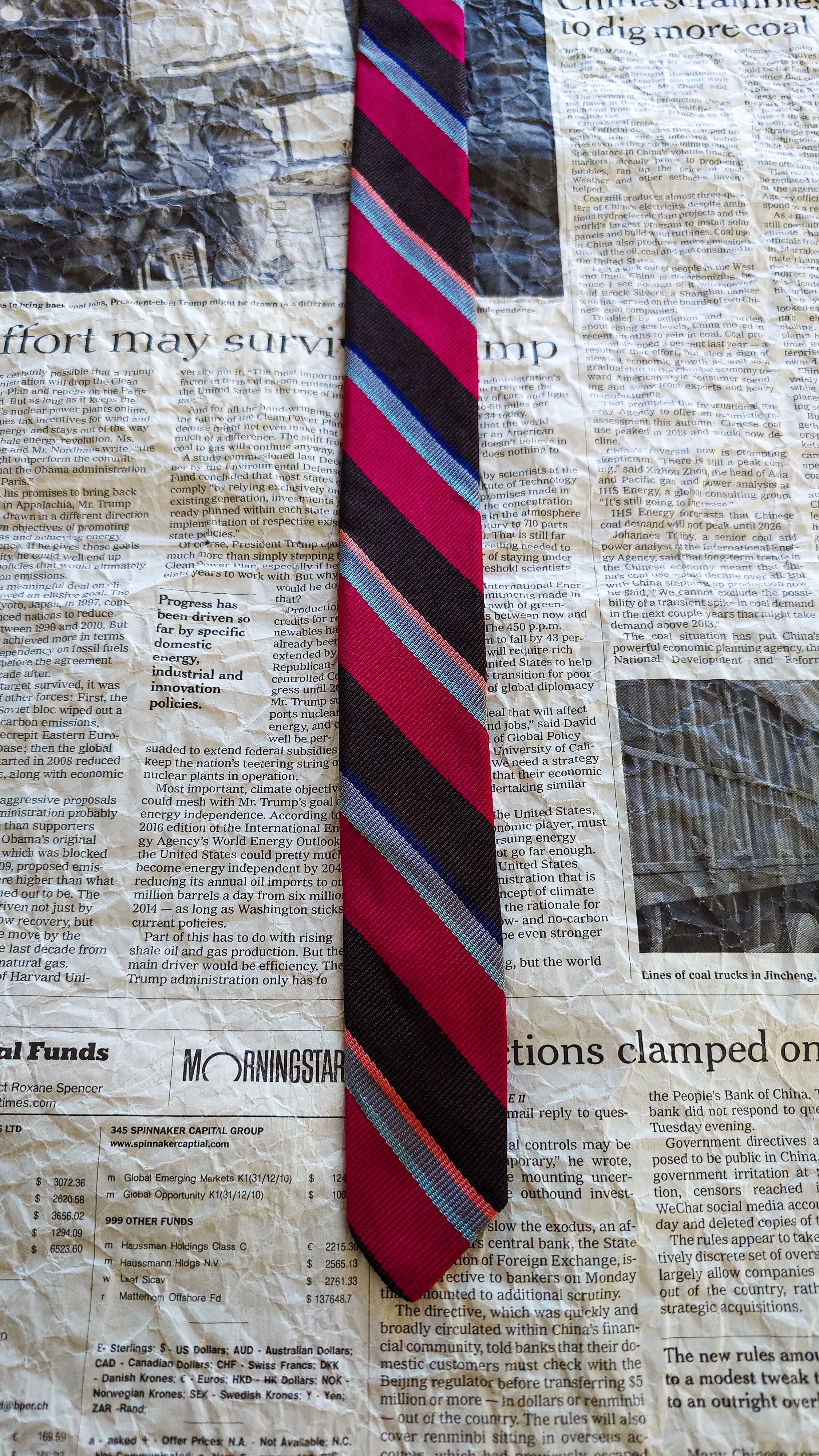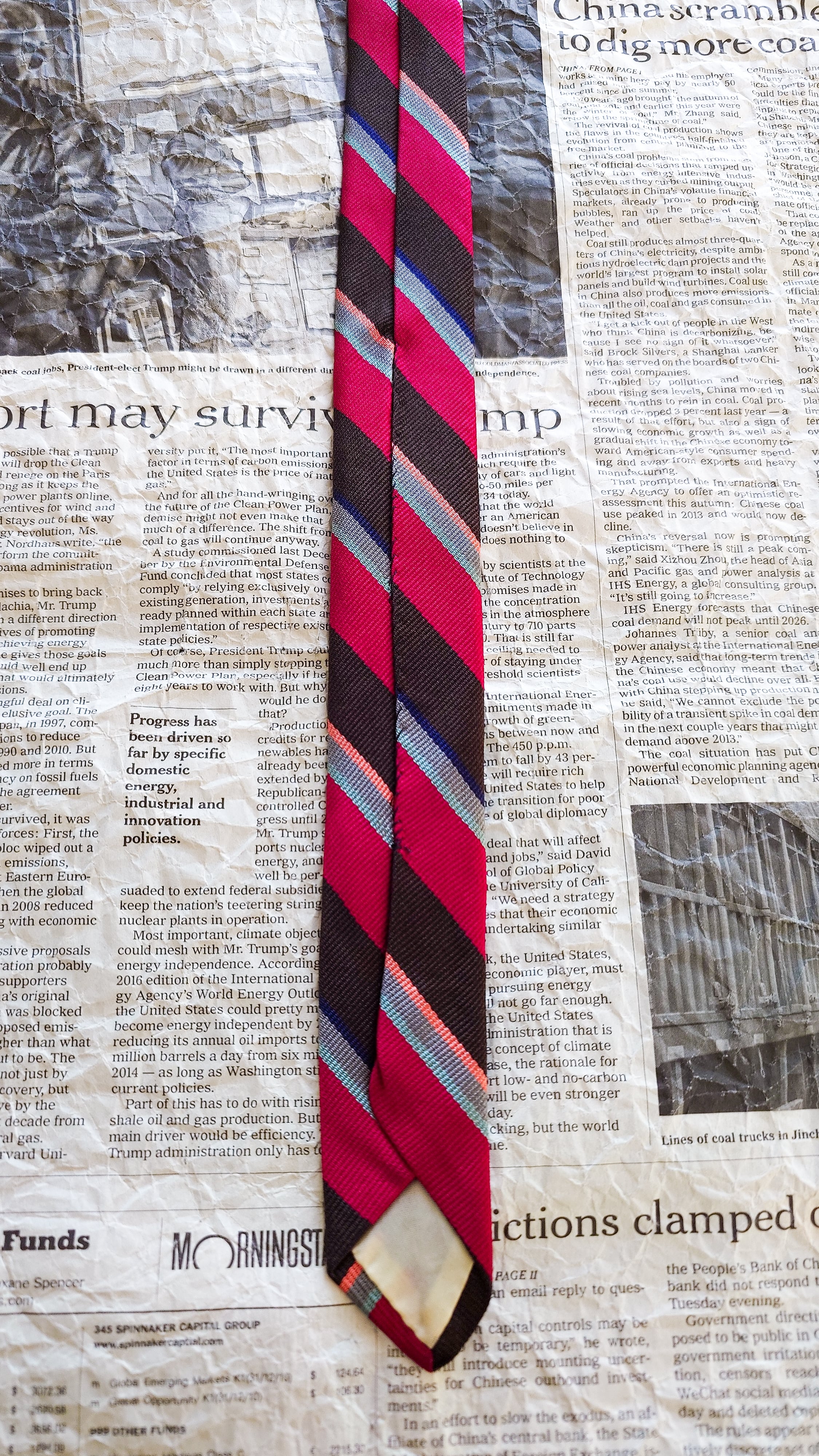 シルク混の光沢がある生地で作られた定番のレジメンタルストライプ柄のネクタイで、カラーはマゼンダ×ブラウン×ネイビー×グレー×ライトブルー×オレンジの配色になります。