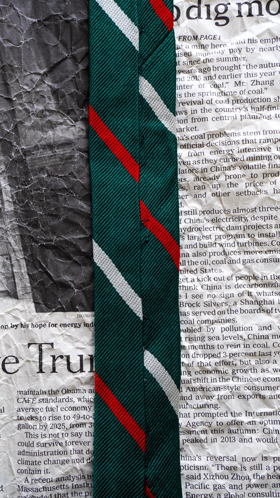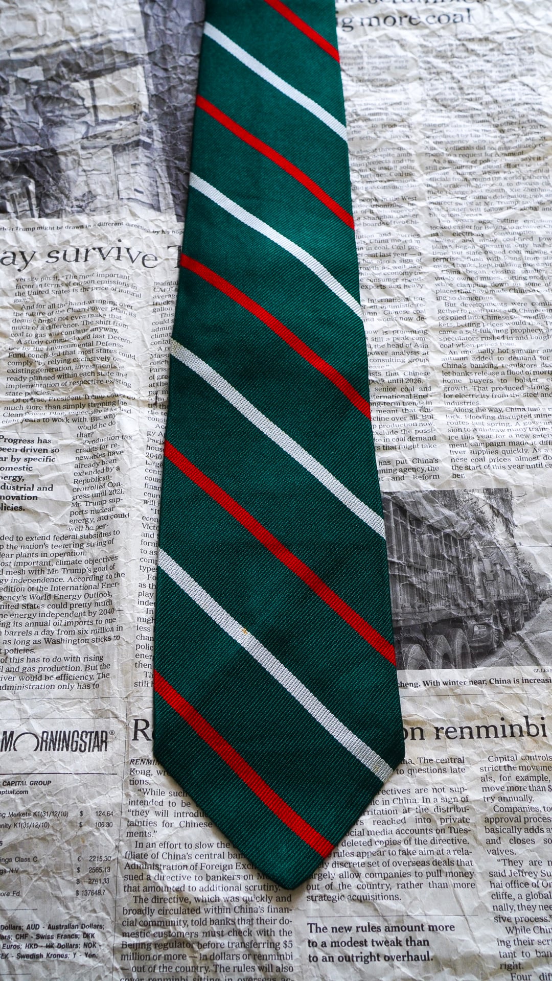 シルク100%の光沢がある生地で作られた定番のレジメンタルストライプ柄のネクタイで、カラーはグリーン×ホワイト×レッドの配色になります。