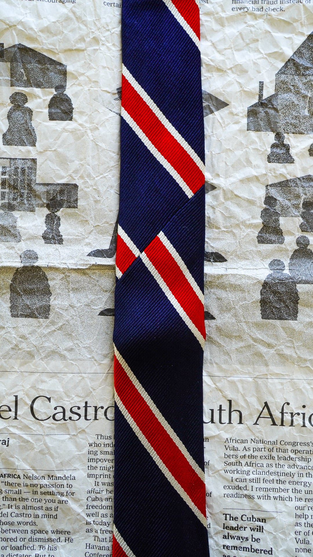 シルク混の光沢がある生地で作られた定番のレジメンタルストライプ柄のネクタイで、カラーはネイビー×ホワイト×レッドの配色になります。