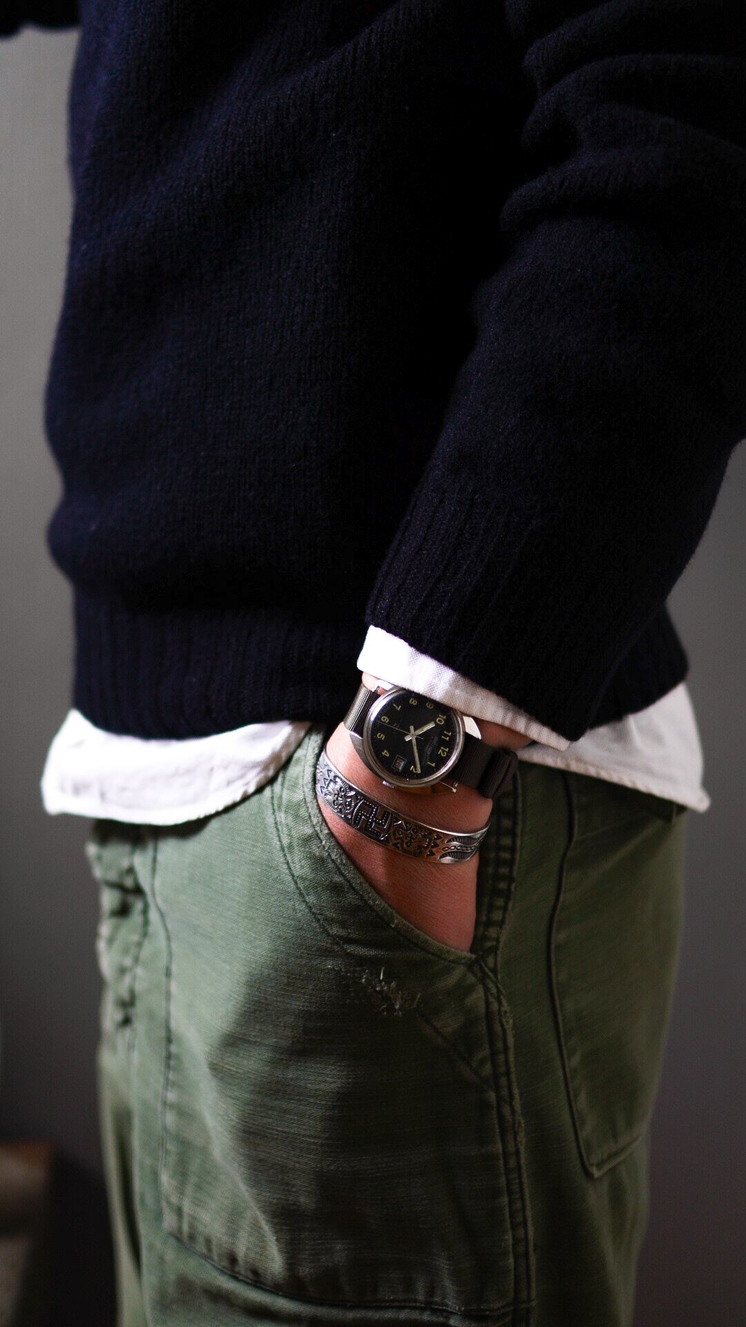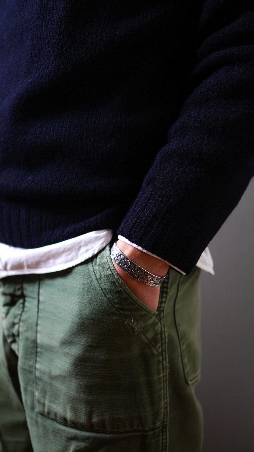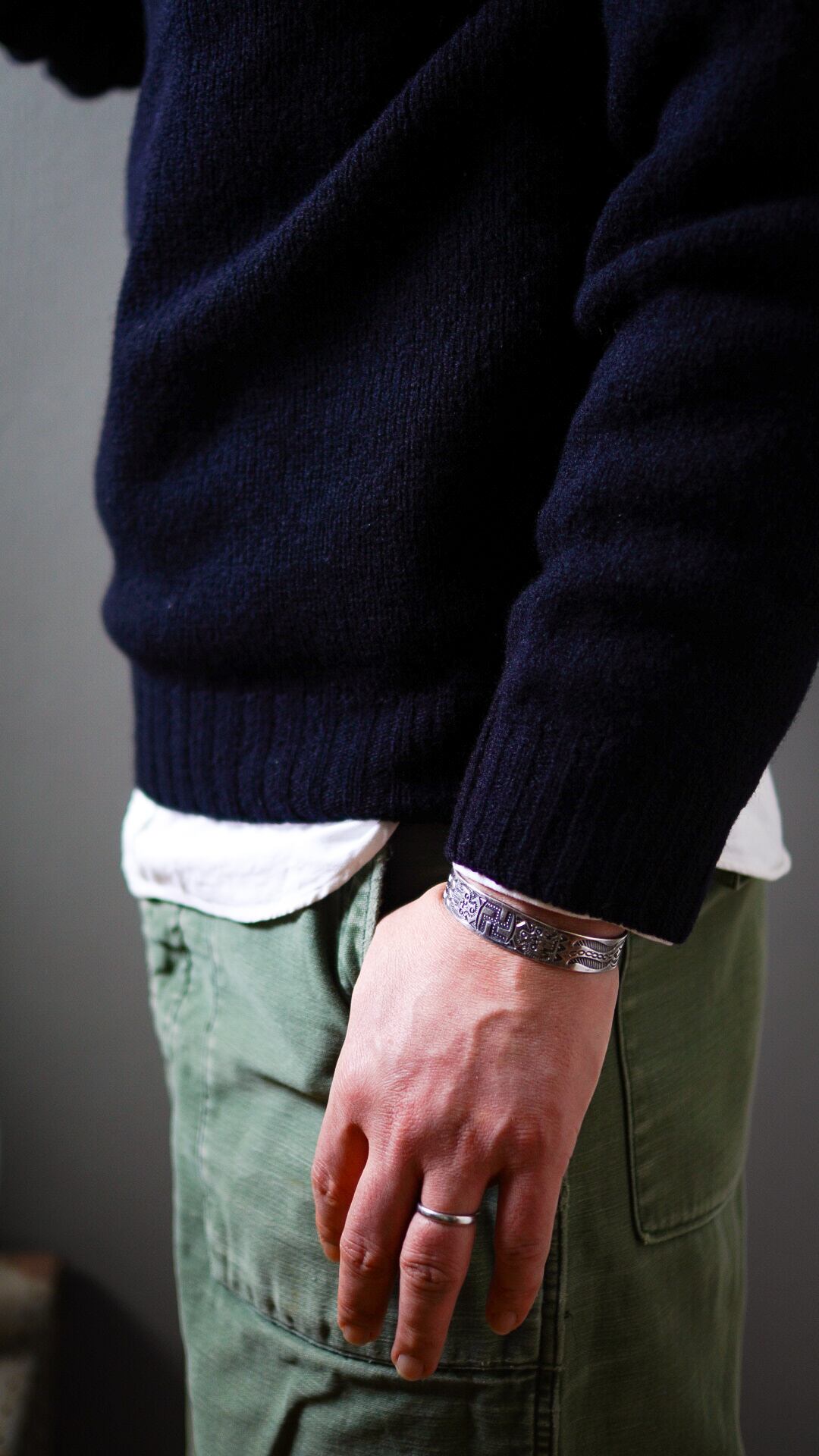 程良い幅のバングルですので、単体でも腕元の主役として十分に活躍してくれますし、他の手持ちのブレスレットや腕時計と重ね付けしても雰囲気良いかと思います。