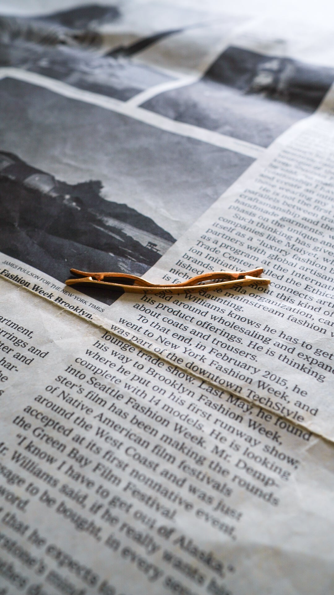 そこで、ネクタイ自体を持ち上げて支えることで、結び目が緩まないようにすると同時に、アーチを作ることでVゾーンに立体的な表情を作る用途としてカラーピンが登場した経緯があり、ヴィンテージネクタイとの相性は抜群です。
