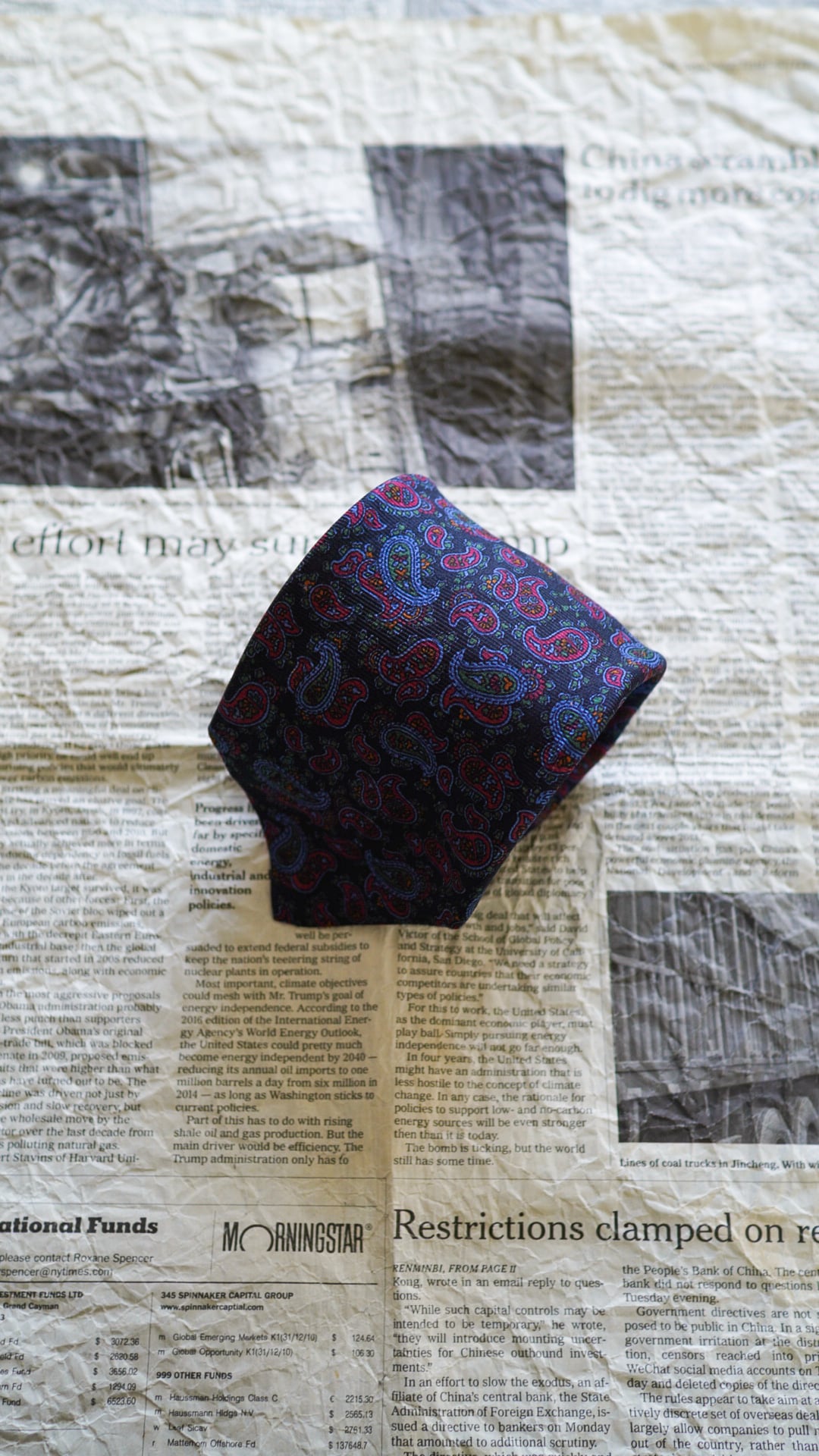 シルク100%の光沢がある生地で作られたペイズリー柄のネクタイで、ベースカラーはダークネイビーになります。